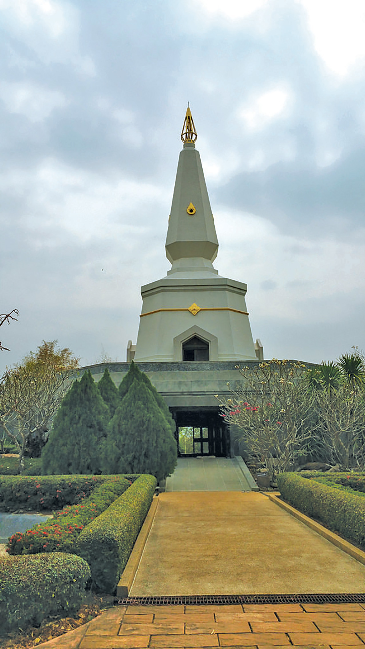经过多年详细的计划,阿姜因哒崴终于实现了他的心愿。他跟一群来自曼谷的铁道工程师一起设计和建筑纪念塔,塔的结构分两部,下部是宽大的梯形塔身,上部是往上逐渐狭小,高耸美观的尖顶。纪念塔矗立在卉晒女众道场附近一块平坦的高地上,从地面到塔顶有八十英尺高,非常壮观。纪念塔周围环绕着水池,池面开满粉红色和紫色的莲花。池边围绕着热带花卉,花下铺满石头,往内一圈是整齐修剪的灌木。塔的外边种了一排遮荫的高树。整个环境氛围格外宁静安详。