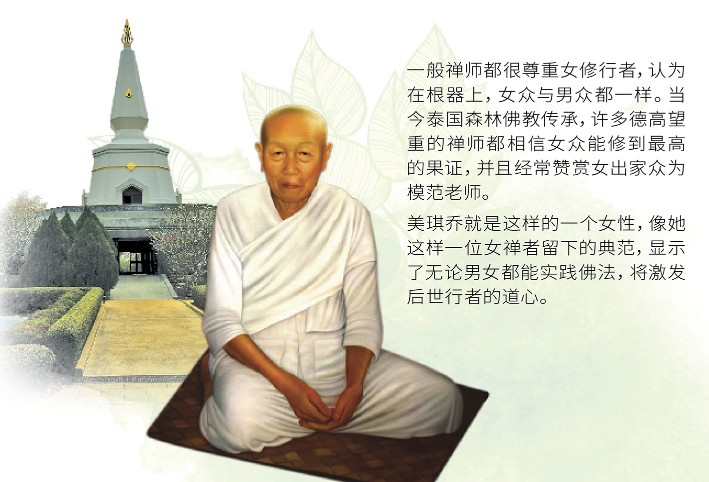 在佛教界,那些禅定精湛的比丘僧众不受文化偏差的影响,他们肯定真正修行的八戒女有能力证得甚深的境界。事实上,女众对佛法有很高的悟性,同时有能力证入深定,培养殊胜的知见和智慧。在泰国,许多美琪和女居士的成就超过男出家众。因此,一般禅师都很尊重女修行者,认为在根器上,女众与男众都一样。当今泰国森林佛教传承,许多德高望重的禅师都相信女众能修到最高的果证,并且经常赞赏女出家众为模范老师。很多森林禅师座下都有受公认为老师的女弟子,这些出家和在家的女弟子积极参与佛教活动,靠自己出色的能力担任禅师、治疗师或者善知识的角色,深受当地社会尊敬。美琪乔就是这样的一个女性,像她这样一位女禅者留下的典范,显示了无论男女都能实践佛法,将激发后世行者的道心。