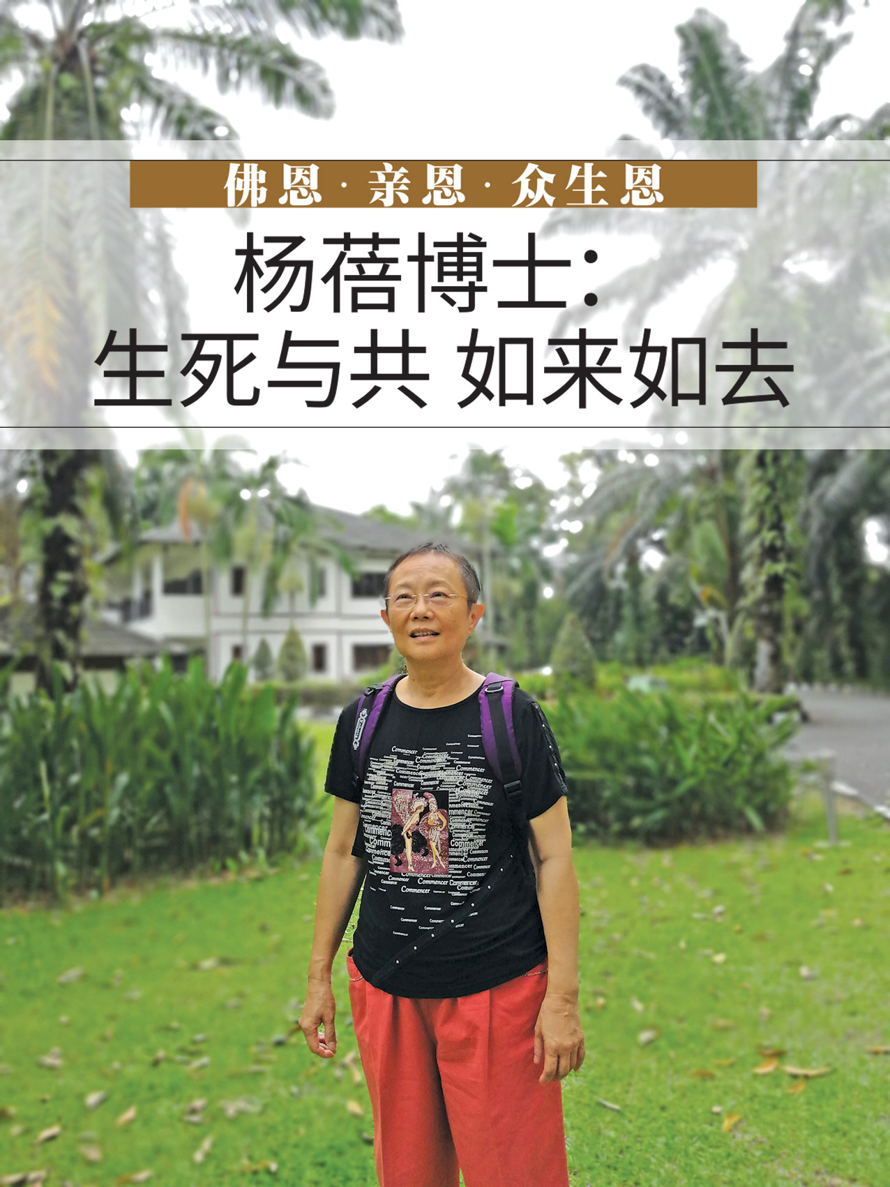 在朋友的眼中,杨蓓博士这两年来,越来越年轻。“我从来没有想过事情要圆满。只要完成了、尽力了、心安就好。”她分享说,生命的无常发生时,所产生的情绪如懊悔、自责、思念、不舍,是正常的,那是情感的一部分,因此我们就把它当作常态,接纳之就好了。生死与共,如来如去!