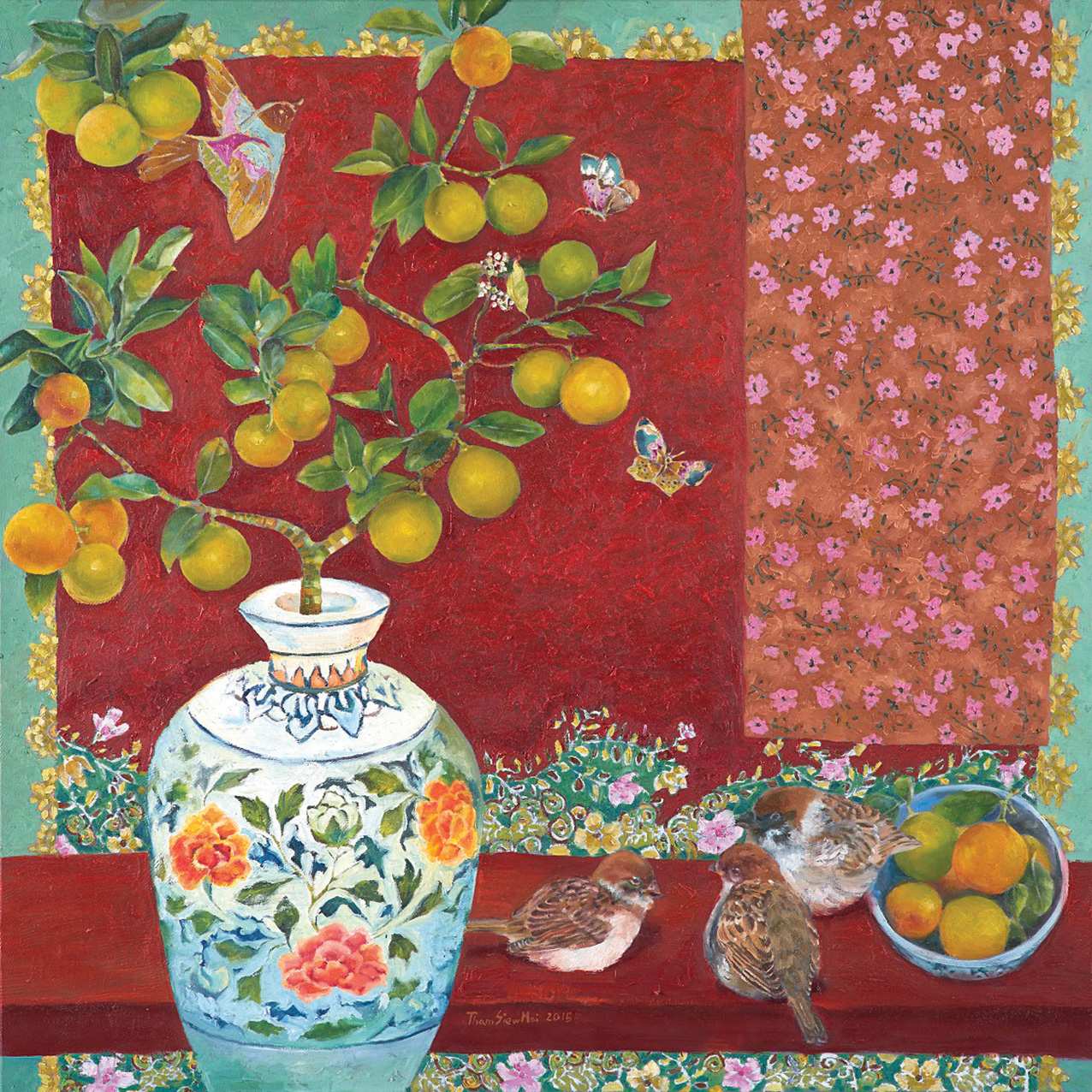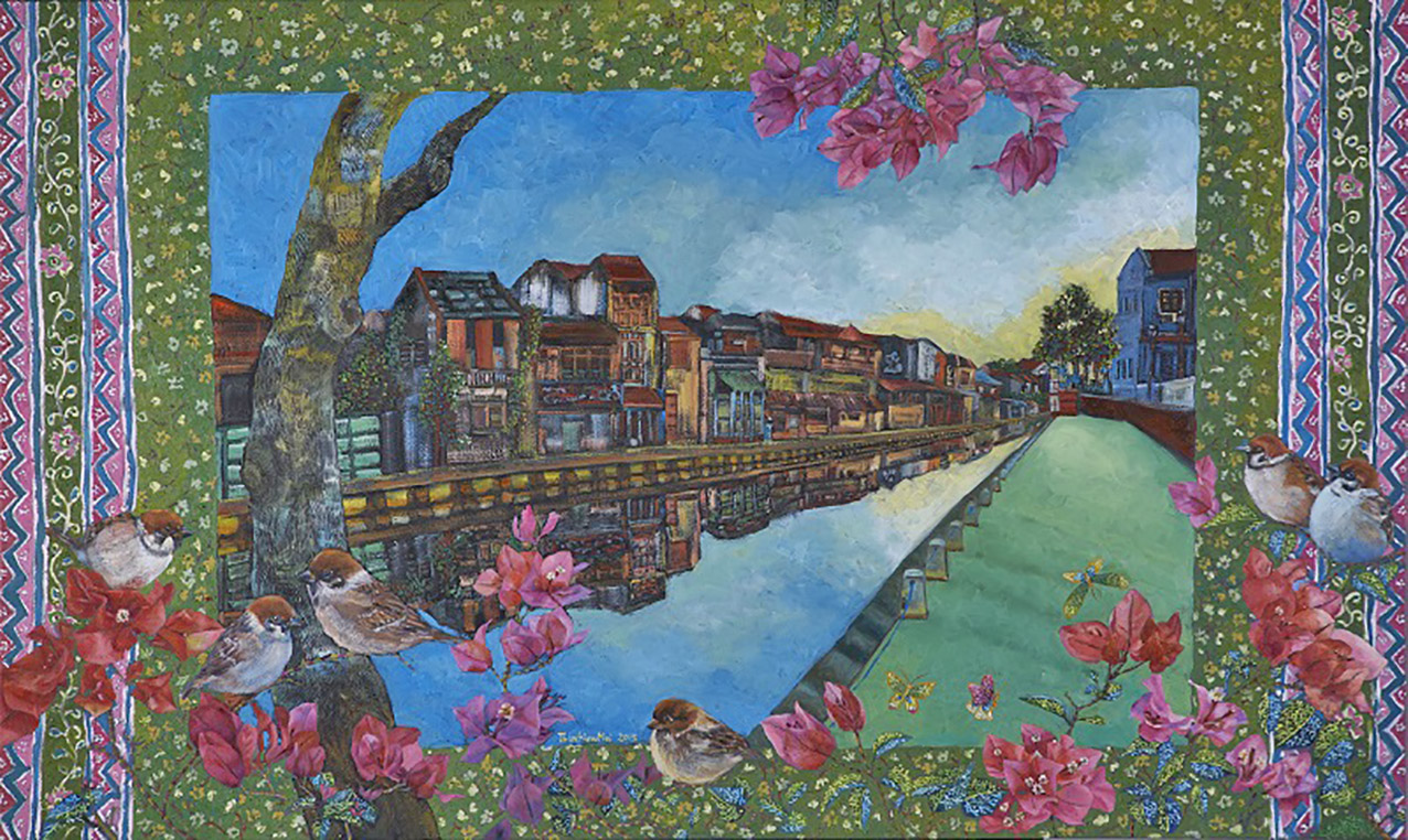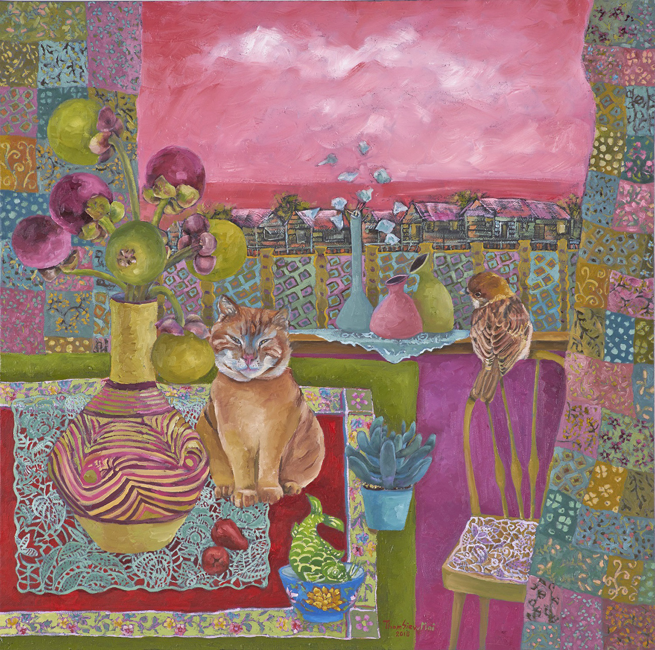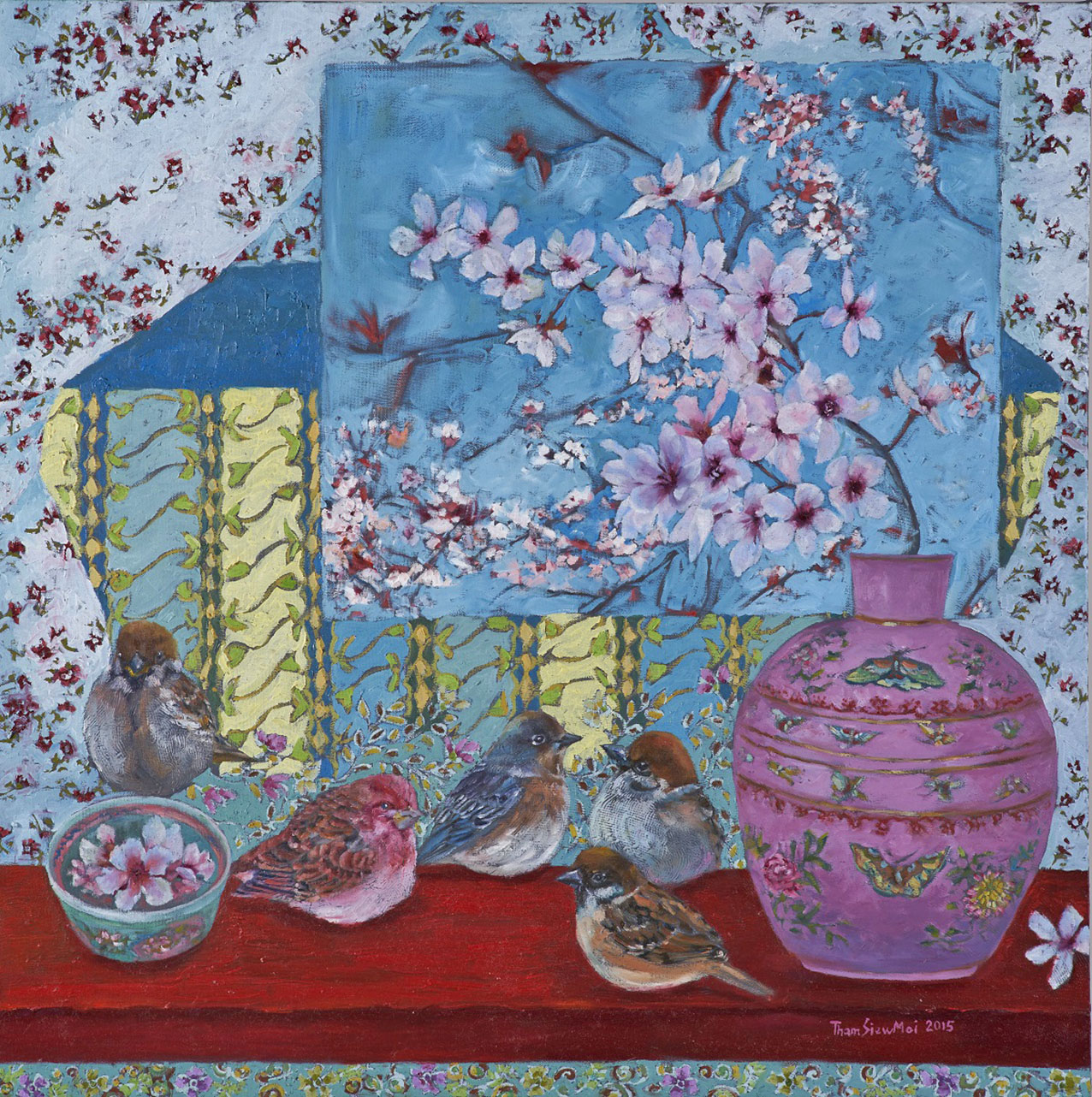 于是在她绘画里的花卉、小昆虫、蝴蝶、鸟儿总是喜悦地飞翔,都涂上浓厚的南洋热带巴迪;乃至中国剪纸的丰盛色彩,绘画里周边的角落总会出现超大粒的番石榴、山竹、水翁具有快乐老实人的心情写照,皆融于生命、生活、创造之中。覃少妹自在地说:“绘画与人生是一体之两面,安住其中,该什么就是什么,自然流露,这就是禅。”