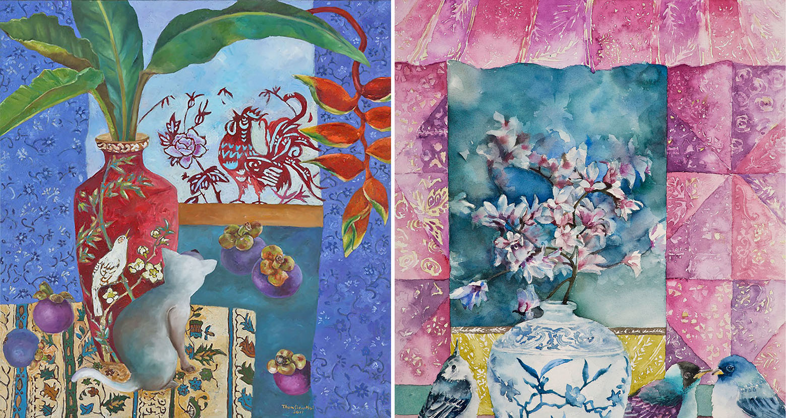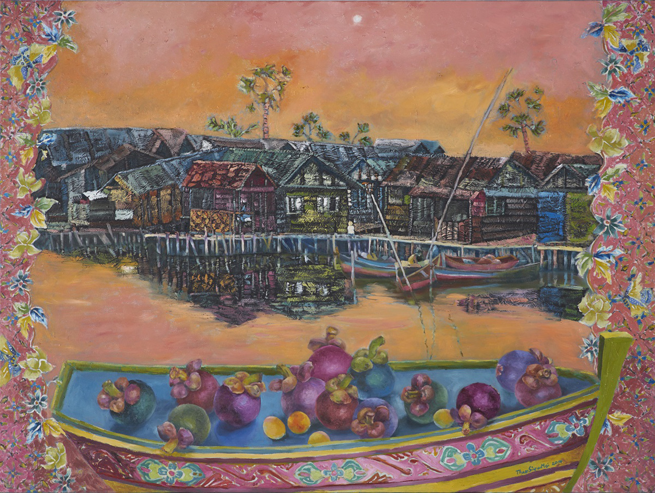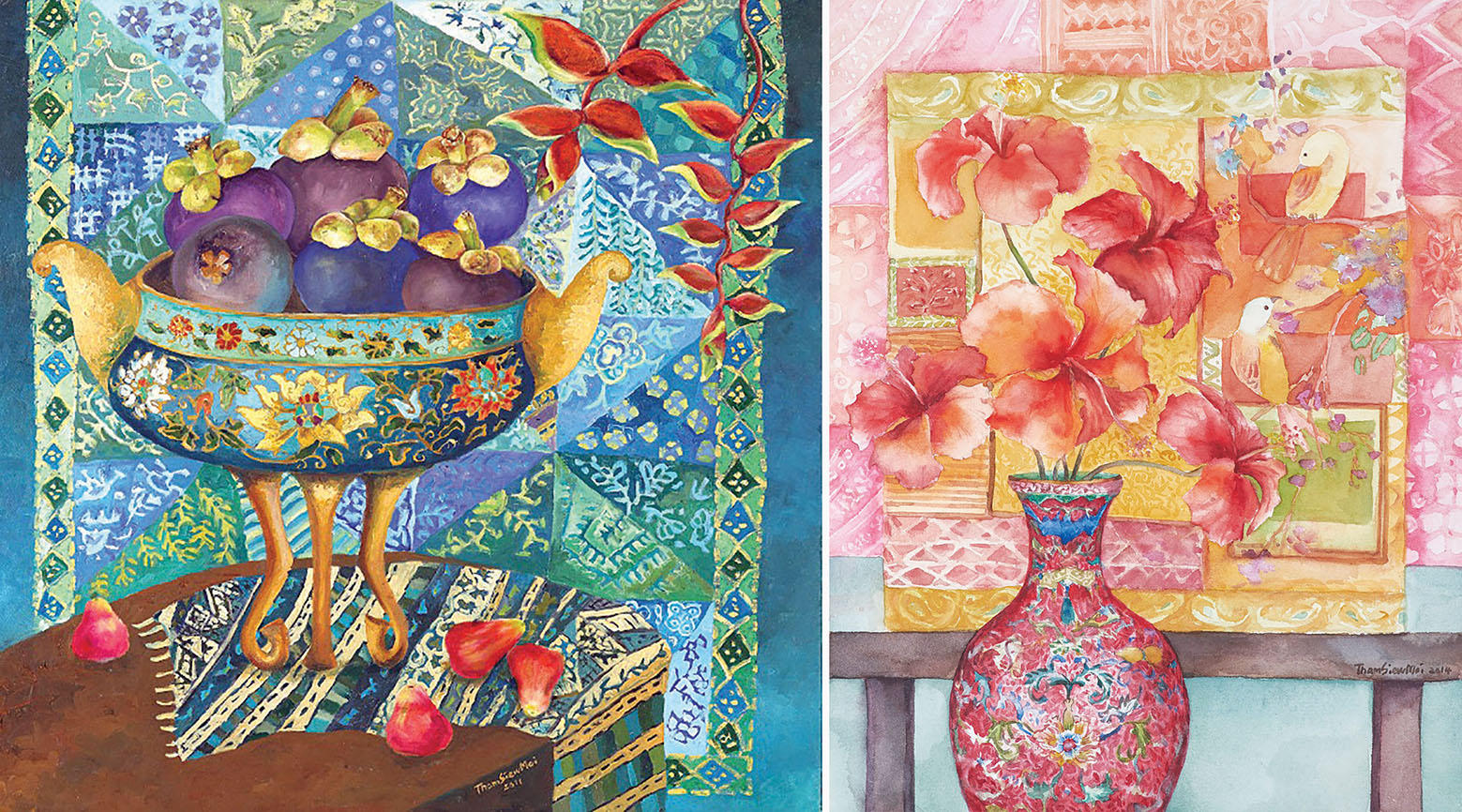 于是在她绘画里的花卉、小昆虫、蝴蝶、鸟儿总是喜悦地飞翔,都涂上浓厚的南洋热带巴迪;乃至中国剪纸的丰盛色彩,绘画里周边的角落总会出现超大粒的番石榴、山竹、水翁具有快乐老实人的心情写照,皆融于生命、生活、创造之中。覃少妹自在地说:“绘画与人生是一体之两面,安住其中,该什么就是什么,自然流露,这就是禅。”
