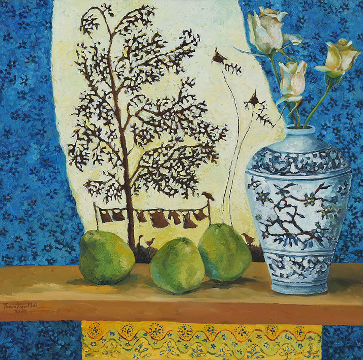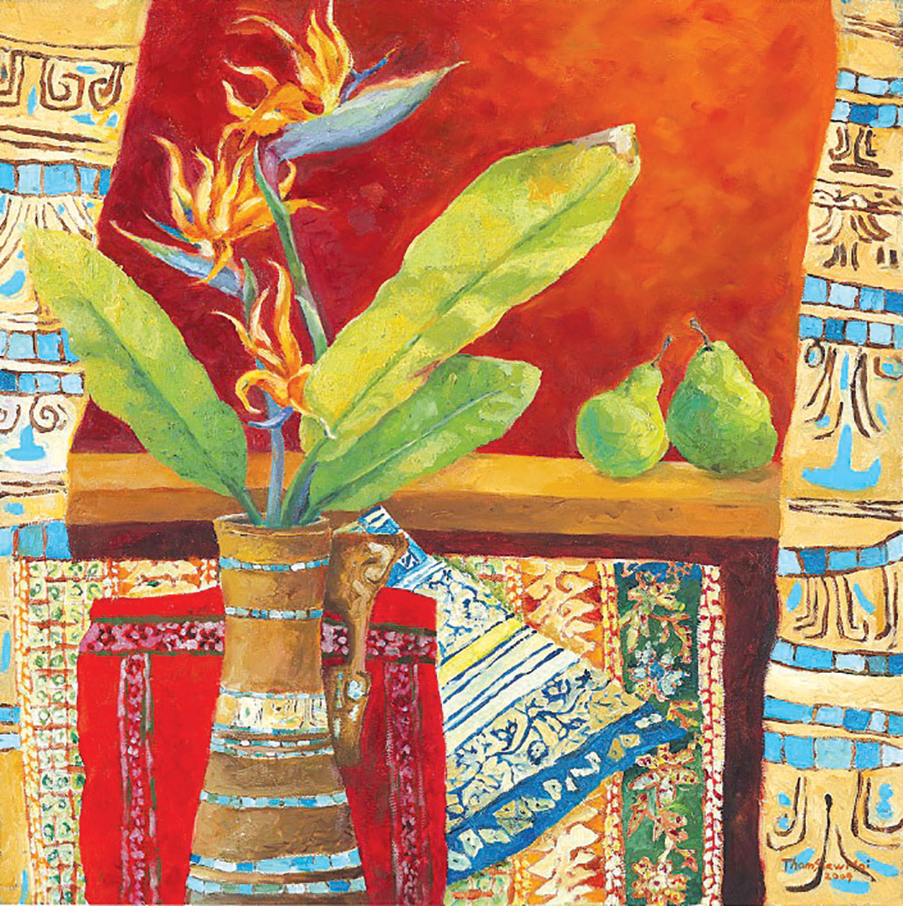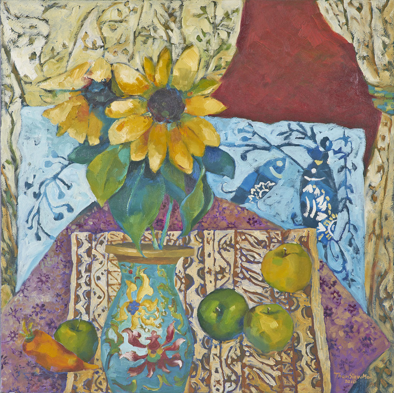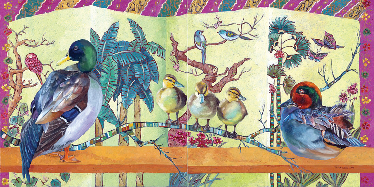 于是在她绘画里的花卉、小昆虫、蝴蝶、鸟儿总是喜悦地飞翔,都涂上浓厚的南洋热带巴迪;乃至中国剪纸的丰盛色彩,绘画里周边的角落总会出现超大粒的番石榴、山竹、水翁具有快乐老实人的心情写照,皆融于生命、生活、创造之中。覃少妹自在地说:“绘画与人生是一体之两面,安住其中,该什么就是什么,自然流露,这就是禅。”