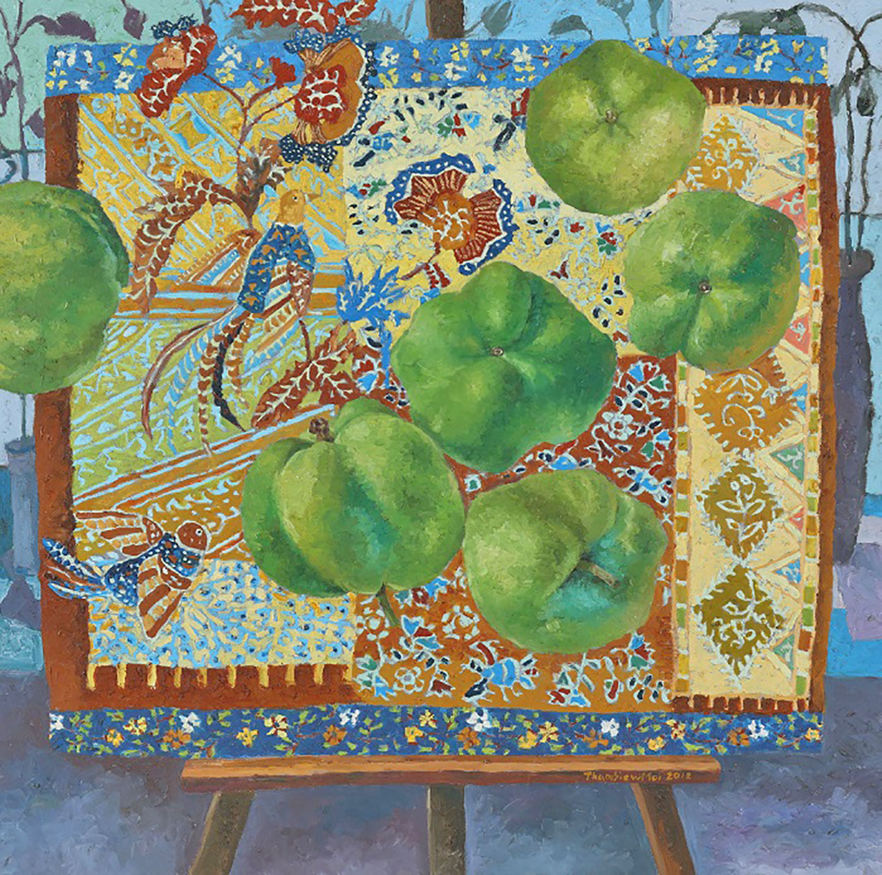 也许你会好奇:“为何她把一幅清晨啼叫的公鸡与下蛋的母鸡题为:《亲爱的家人》呢?”,原来那只雄赳赳的公鸡,有一双她怀念爸爸每天清晨就要爬起来割胶养家慈祥的眼神,而总爱唠唠叨叨催孩子上学做功课的妈妈就像刚下蛋的母鸡那样充满生命力。又好比《相遇好时光》画里几只小麻雀快乐的谈天诉旧,画中有长得丰盈的桔子、花香、碎花布图案,用了亮丽的色彩来表达她对季节的欢乐与喜悦,合家大团圆。