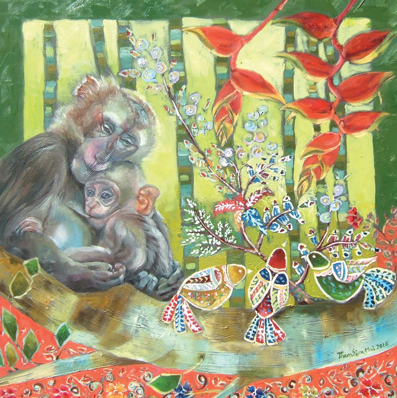 在这新的一年,覃少妹画出心目中的吉祥母猴在哺乳着幼猴儿,花瓶里的爆竹花呈现一片喜洋洋,充满温馨的母与子猴儿,安住其中,柔美中更显得坚定,如斯春天的讯息,唤醒我们的觉性,让我们看见内在心性的无限光明,光明的心,光明的春天。