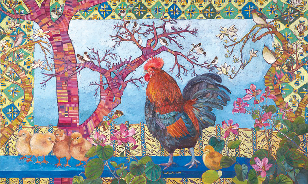 山静云闲,春暖花开,但是,每个人所见的春天风光不同,心境愉快的人画出的一花一草无不是春天,无不是人间好时节----看覃少妹画笔下活泼的大公鸡、母鸡、小麻雀,还有一只正在哺乳的母猴子,都在向大家传达吉祥如意,在现象混乱的土地上带来一道稳定之光,提醒人们,即使被现实生活的种种压力所困扰,瞧,大自然与人们的心不正是流露光明、良善、喜悦吗?