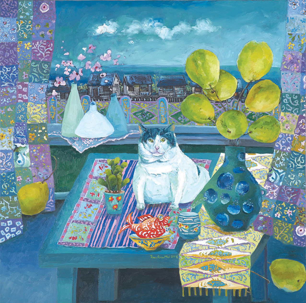 她不想让艺术只是谈纸上之作,而是一种让个人、社会趋向净化的内容与形式,故她一幅:《小息》里的小肥猫静静的坐着,其实对生活有点无奈了,挣扎的碗中鱼就似目前人民生活与理想的拉锯,瓶中的番石榴都“反了”就像当今社会好多事物常颠覆于反常与无常之间----但村中屋看似又一片的宁静与祥和,这就是覃少妹近期在吉隆坡苏丹街JETH画廊举办《美之源》系列画展,最强烈的一幅时下民心;风起云涌的代表作。