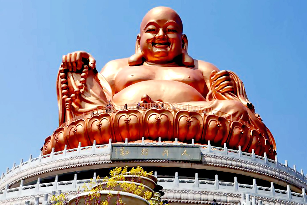 他用慈心爱护一切众生,永远对你微笑,这是供养布施给你,让你心里常生欢喜心,所以塑这个形象。让每个人一进到寺庙里,看见他生欢喜心,就这样教育你。