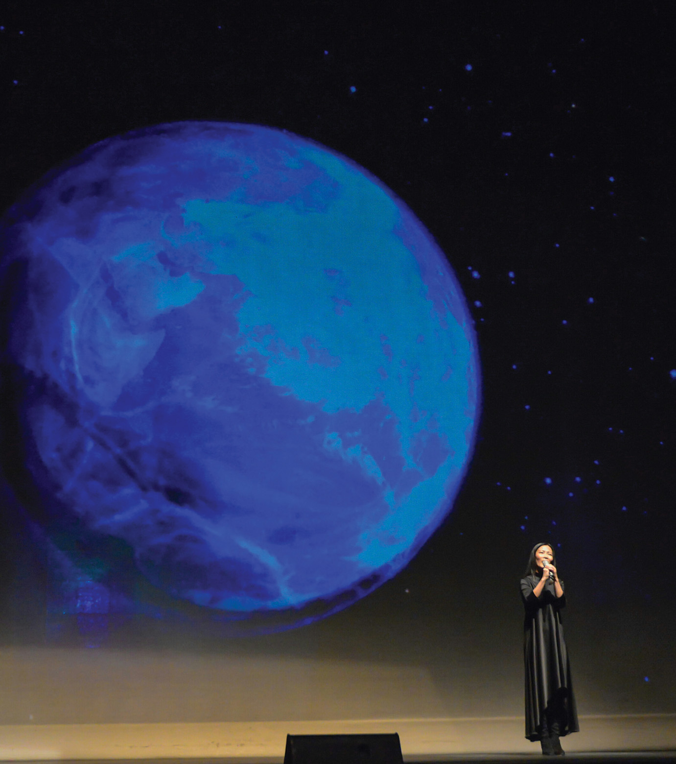 漆黑背景夹着一束黄光,舞台上的我手持麦克风向那无际广阔的虚空唱诵经文。背后巨大LED 视屏上,青蓝色立体动画的地球,正在辽阔无边的宇宙缓缓旋转。这一切巨大广阔的拼图里,我觉的最瞩