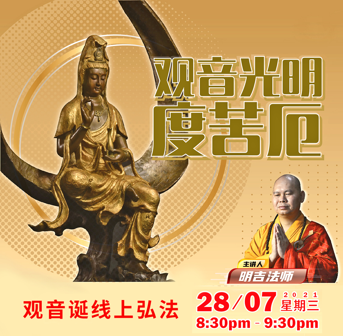 为了让更多人认识及接触此殊胜法教,明吉法师特别在观音圣诞的晚上,于线上弘法《观音光明度苦厄》,传授“光明普照随身妙法108”观音菩萨的修持法门,希望让更多人获得利益,进而避免受到负面消极的情绪影响,培养正面积极的生活态度,在世纪疫灾中安顿自己身心的好方法。