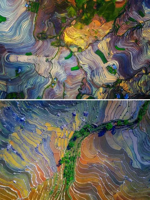 “每年五月,在梯田的浇灌季节,水从一处倾泻到另一处,与大地的颜色和天空中的云彩融合在一起。在梯田表面产生的光反射水混合在一起,创造出五颜六色的图像。”