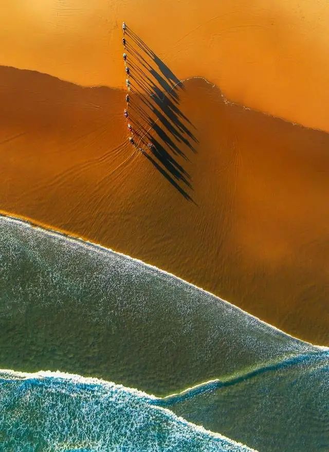 “将无人机飞过海洋,我发现了接近的骆驼,船上有人类客人,并注意到美丽的光影,以及海岸线上雄辩的波浪图案。”
