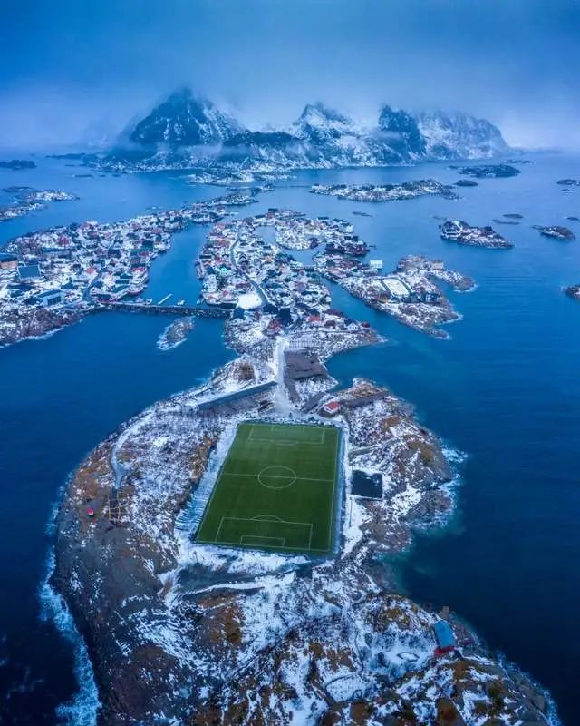 “罗弗敦的Henningsvær渔村的足球场很特别。绿色的人造草从冬季景观中脱颖而出。你敢在这里踢球吗?”