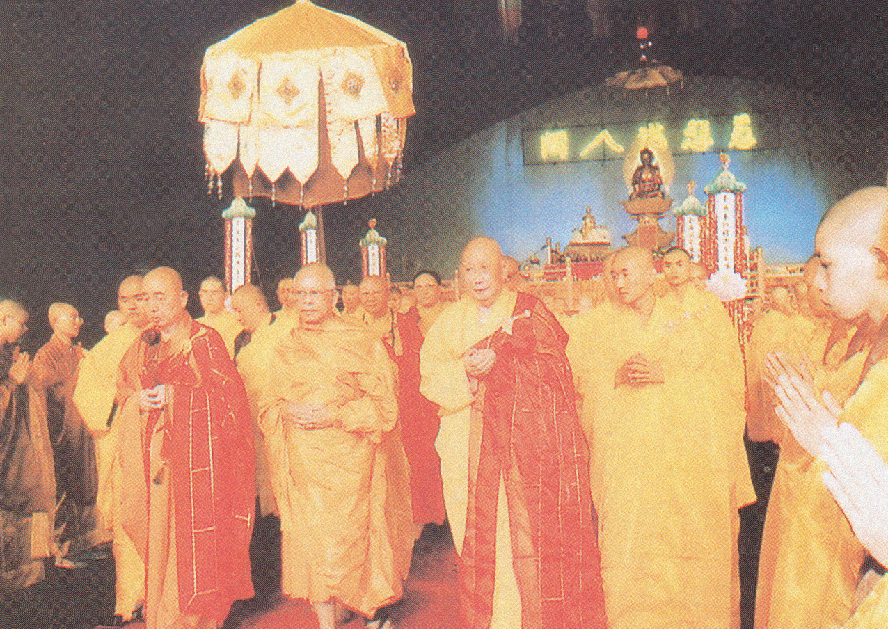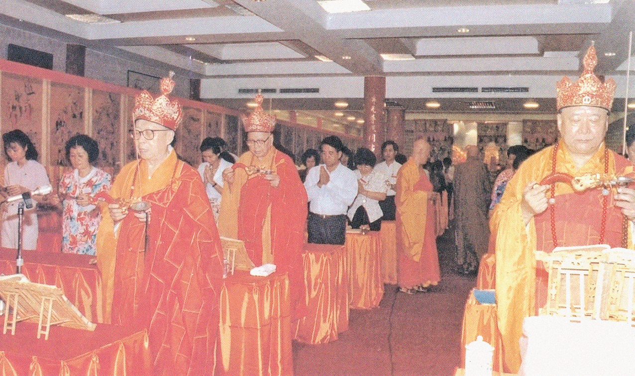 1994年7月,镜盦长老、泰副僧王和觉光长老主持万人皈依大法会。