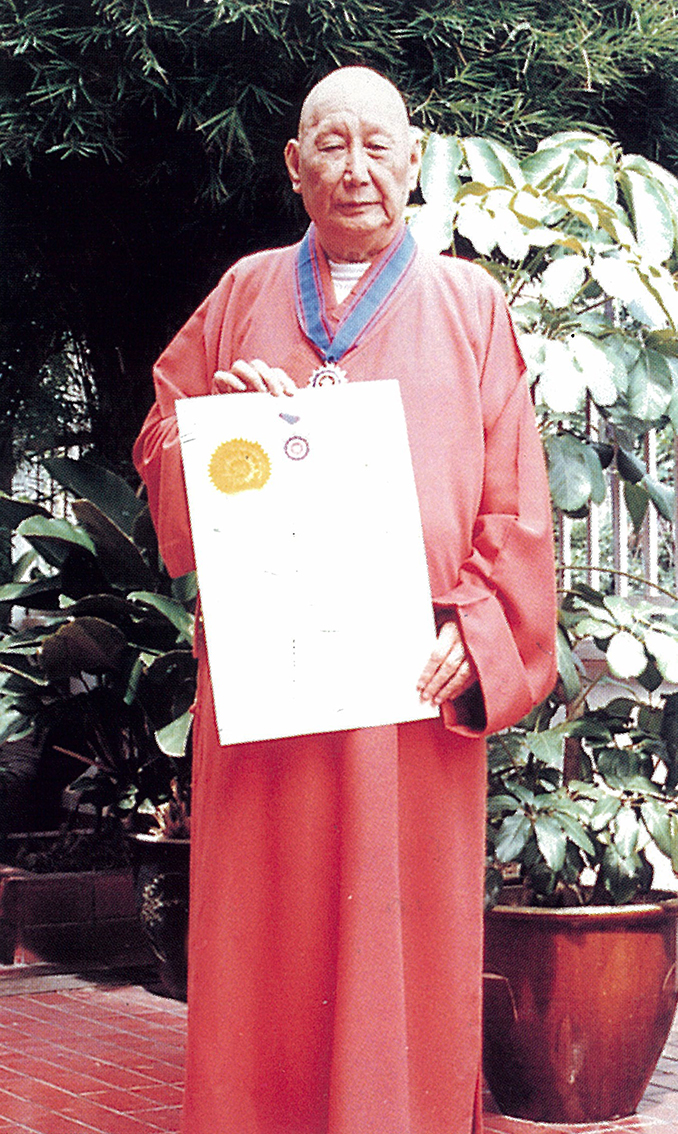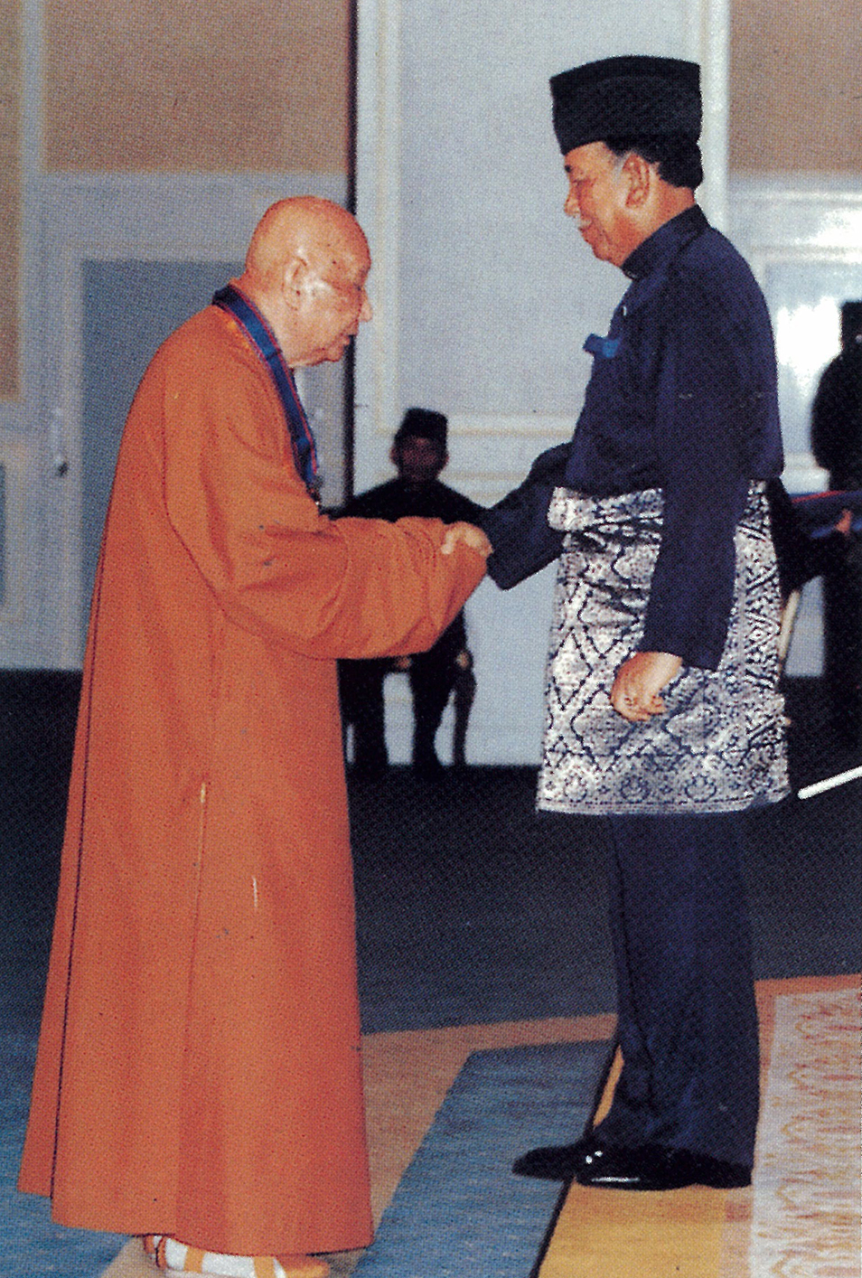 镜盦长老是穿着汉传僧服,在最高元首手上接获颁授。那照受封赐的照片,至今还高挂在八打灵观音亭的办公室。