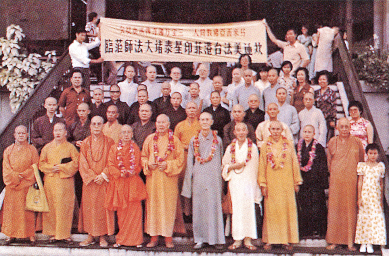 ◆ 热烈欢迎美、法、台、港、菲、印、星泰诸大法师莅临大马弘法,右二为镜盦长老、中间穿灰袍法师为印顺导师。