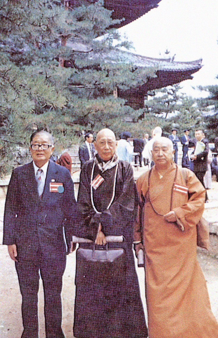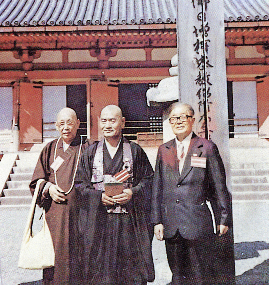 ◆ 镜公与中华民国代表悟明法师、李骞居士于日本世界僧伽大会上留影。