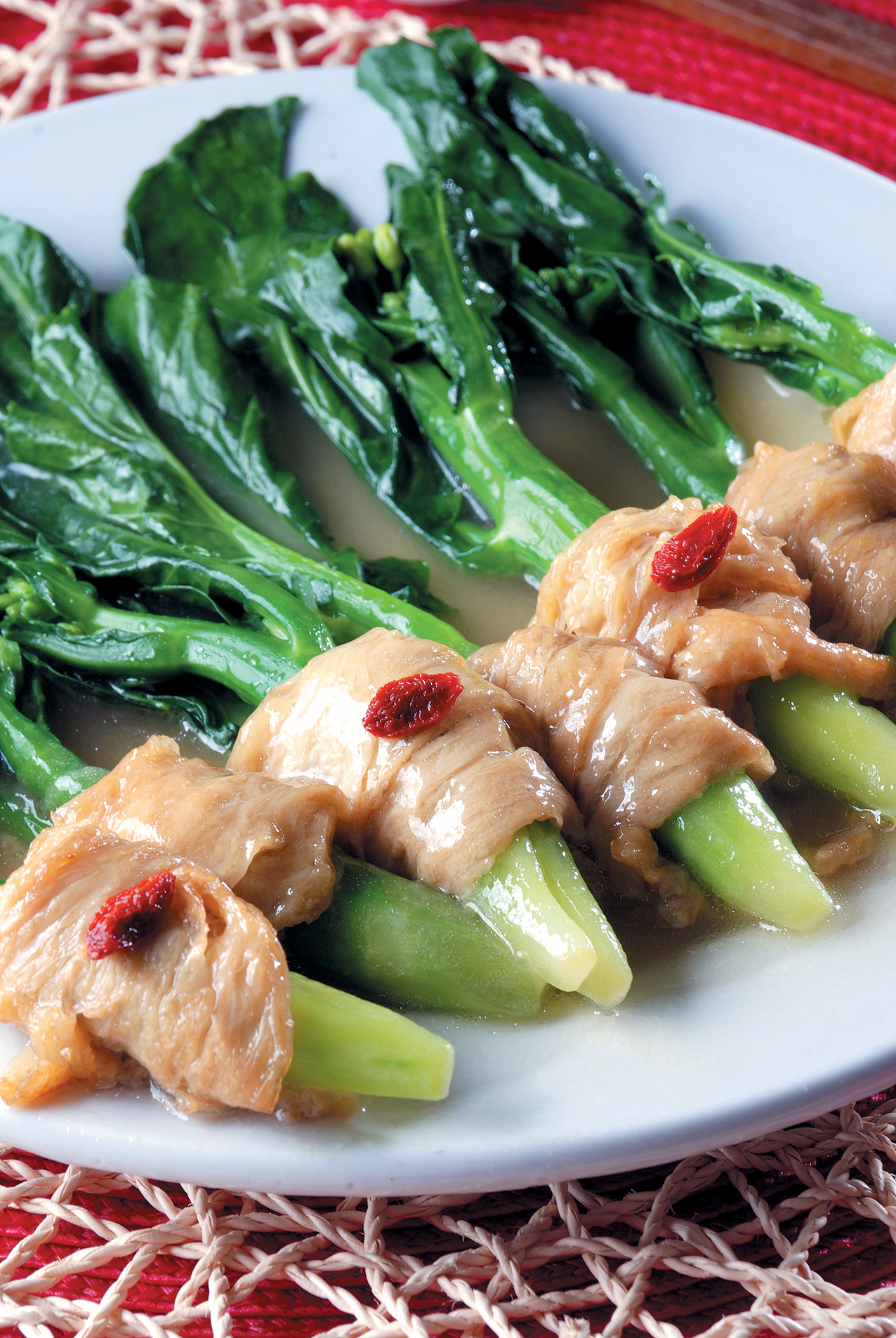 5.把芥兰心滤干水份,在每支芥兰心的头端沾上生粉,再卷入豆包,排上碟。
