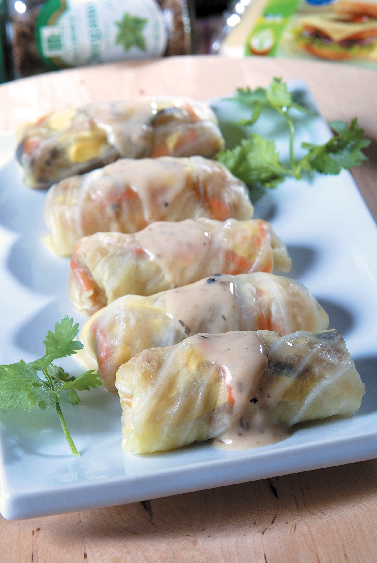 4.煮滚芝士献汁,勾芡淋上包菜卷,即成。