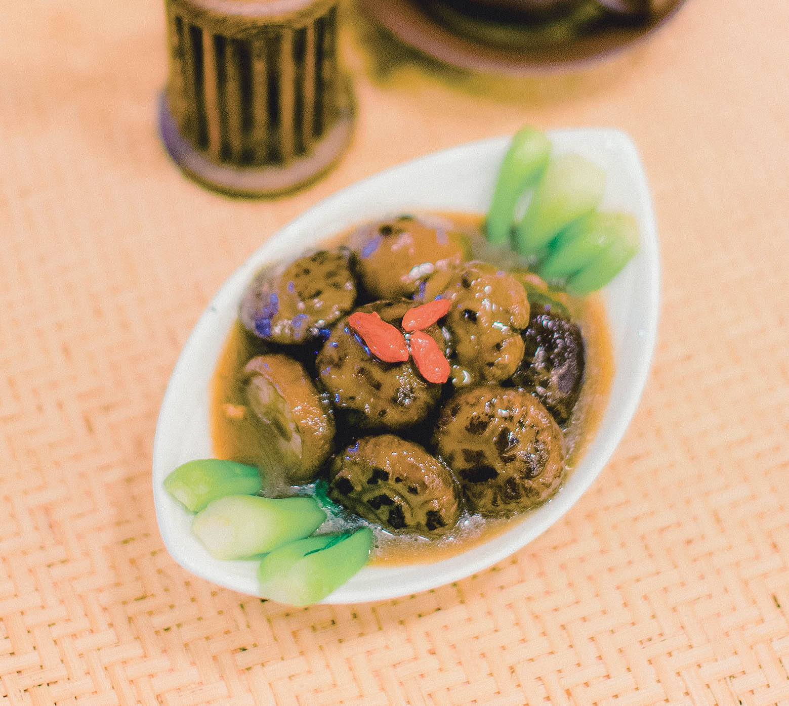 “食材一下锅,就不能走回头路。”这是“家传炆冬菇”的宿命,也是最能反映厨师功力的料理。这炆冬菇的制作程序,不外乎醃、爆香和炆,看似简单甚或家常,但中间的细节和讲究却不少:“醃过的花菇一定要水滚后才加入,小花菇会更加软滑可口。”陈淑娴以几近不藏私的态度,分享她这道“家传炆冬菇”,其中的秘诀是醃冬菇的食材是糖和生粉,为了提香加少许桂皮、八角。这秘诀原来是传承她妈妈的智慧,自小耳濡目染妈妈炆冬菇的配方与制作,简单甘醇的妈妈味料理有着浓厚温暖的感情,是她记忆深刻的家传之宝,也是她诠释“初心不忘”的料理。