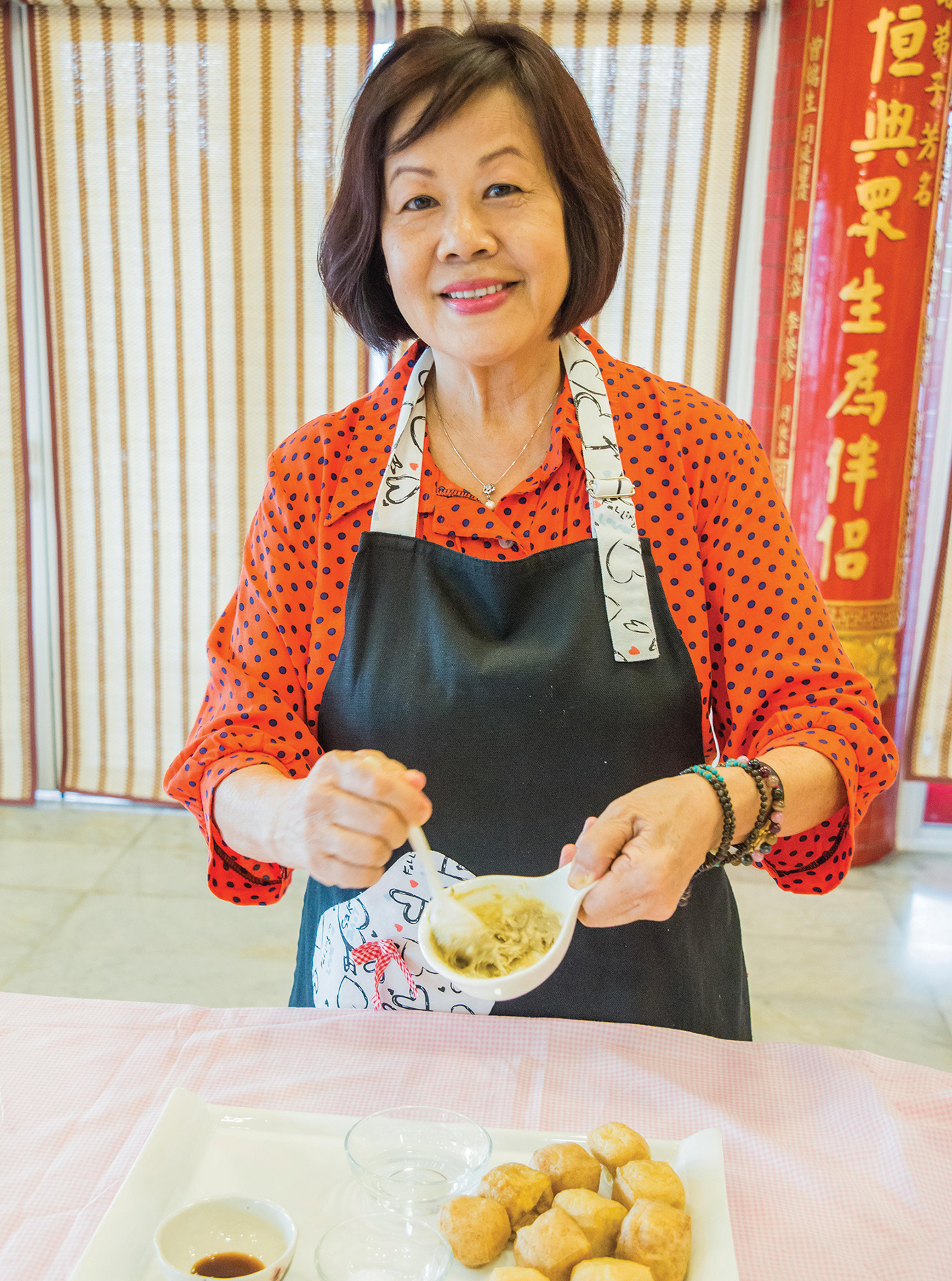 只有扎扎实实的围上围裙,示范料理,身为八打灵观音亭素食烹饪班导师已有30年的达人,陈淑娴即使对所有步骤都熟悉异常,料理时,仍十分专注,所有的讲解与提问,都得等到她上菜后,才可以开始。