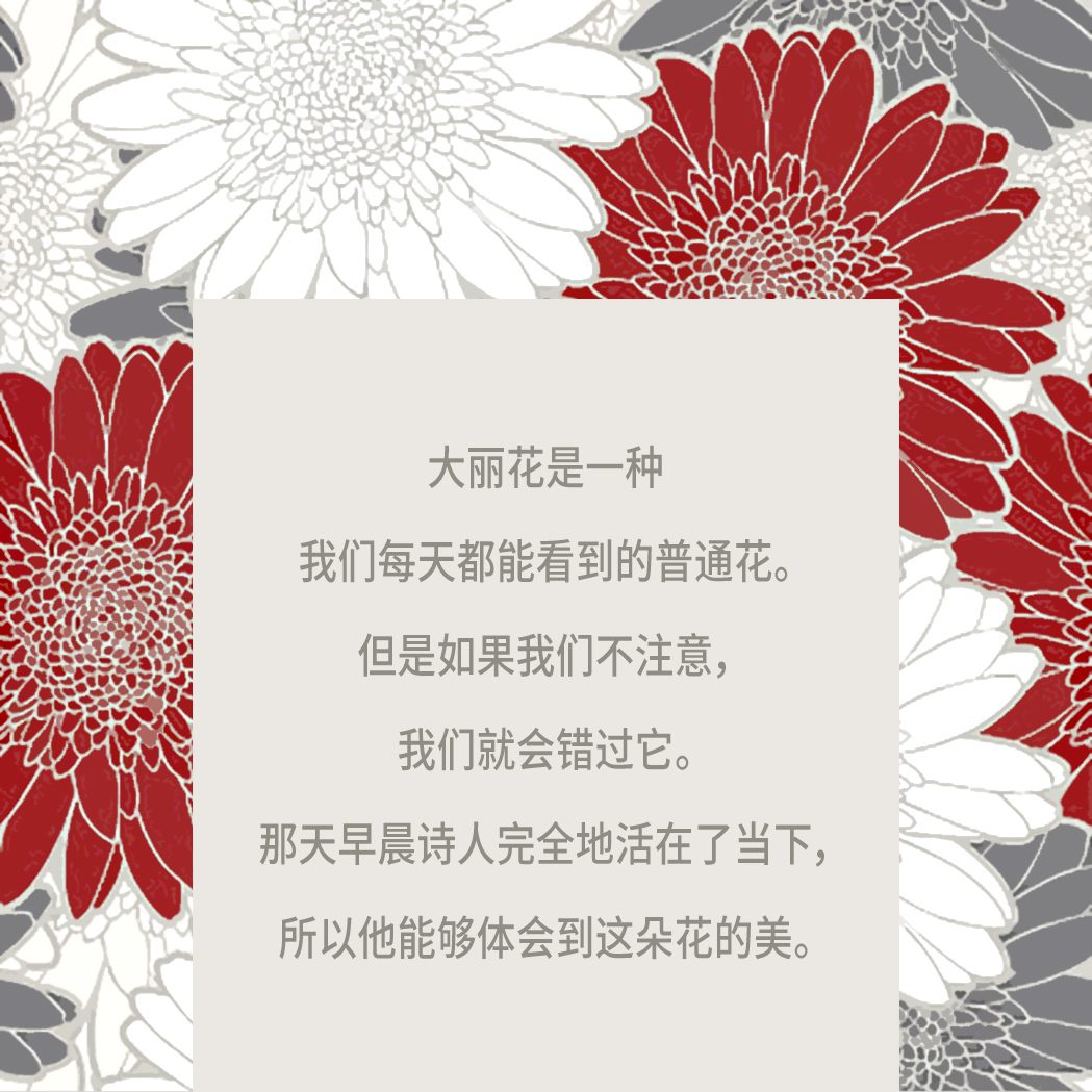大丽花是一种我们每天都能看到的普通花。但是如果我们不注意,我们就会错过它。那天早晨诗人完全地活在了当下,所以他能够体会到这朵花的美。花的歌声本来一直就在那里回旋,只是当诗人突然之间步入了毗卢遮那佛、法身佛的王国,才听到了它。出于尊敬,他深深地鞠了一个躬。大丽花是佛,每时每刻都在慈悲地讲法。因为我们被无明所障,听不到它在讲法,但这不意味着它没有在讲法。事实上,一切事物——青草、鲜花、绿叶、卵石,所有这些无不在一直宣讲着《妙法莲华经》。