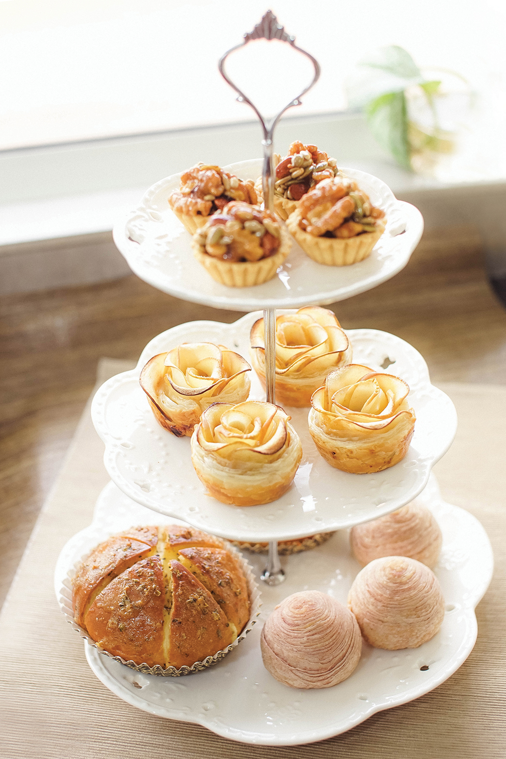 一顿意犹未尽的浪漫晚餐, 或许少的就是法式玫瑰苹果酥皮挞。沏一壶七十五度的玫瑰花茶, 或小啜一杯法国红酒, 一口一口品尝着苹果酥皮挞, 那一夜的月光一定特别灿烂。