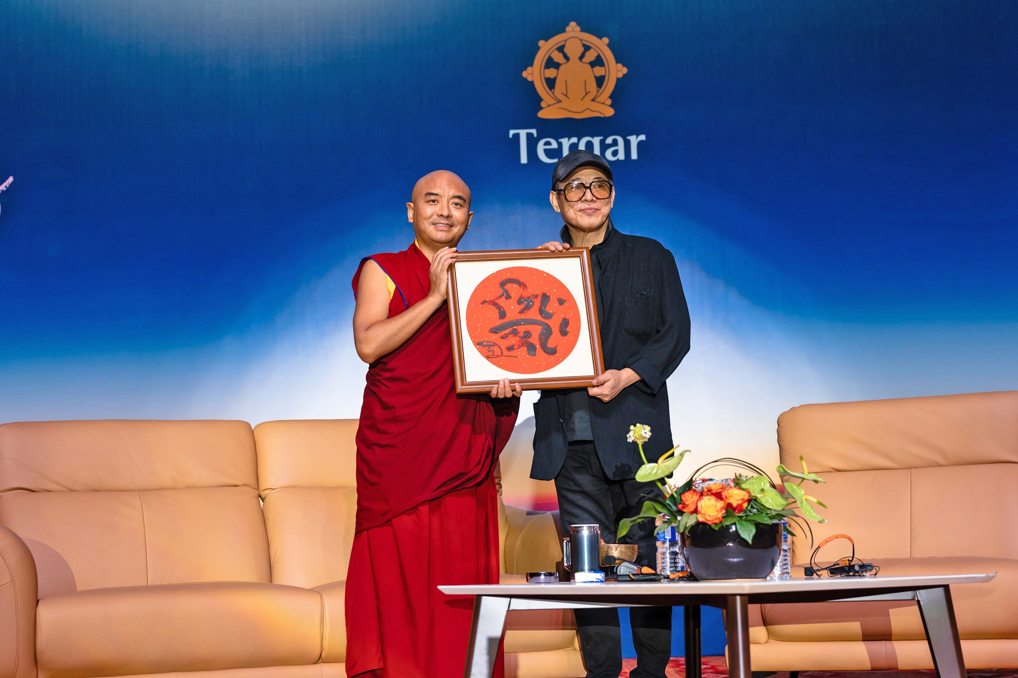 仁波切亲自以藏语挥毫, 写下书法“觉空”二字, 赠予李连杰。看似一副简单的书法, 或许, 明就仁波切在为李连杰传授心法。