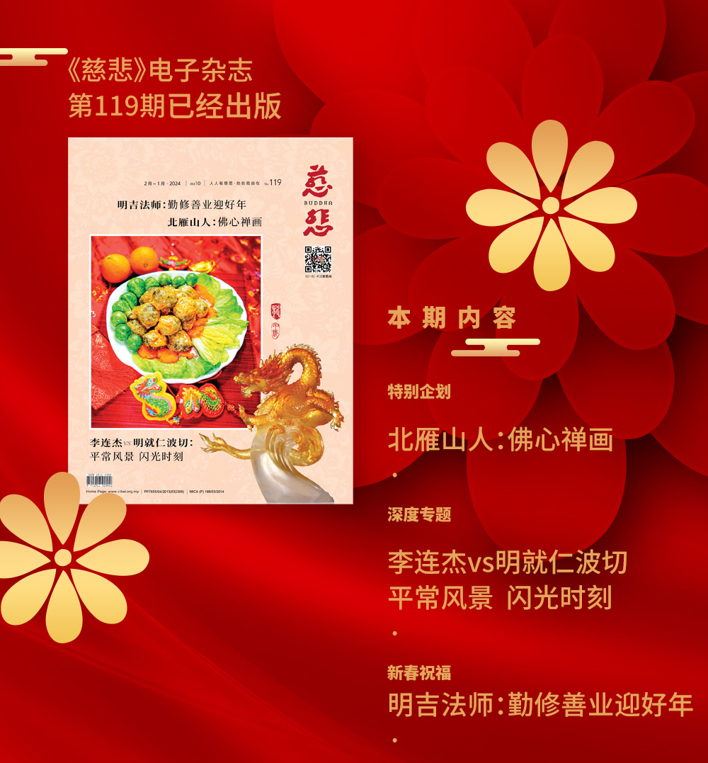 现在也推出内容相同的电子版《慈悲》杂志,1年4期 只需RM 40,为了回馈30年来的《慈悲》杂志读者的热心护持,凡订阅电子版《慈悲》杂志3年;即赠阅《慈悲食谱》第2集,有关订阅详情请浏览《慈悲网》。