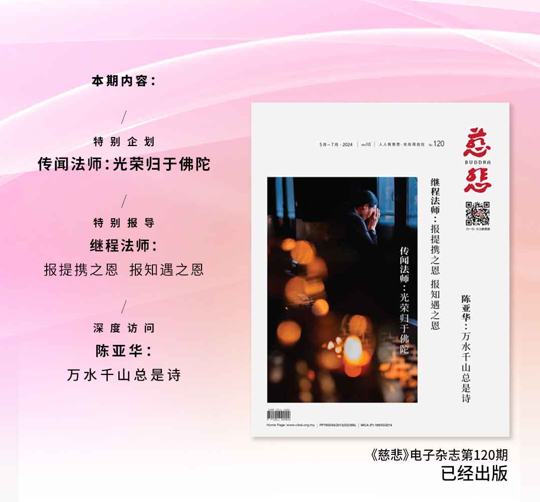 现在也推出内容相同的电子版《慈悲》杂志,1年4期 只需RM 40,为了回馈30年来的《慈悲》杂志读者的热心护持,凡订阅电子版《慈悲》杂志3年;即赠阅《慈悲食谱》第2集,有关订阅详情请浏览《慈悲网》。