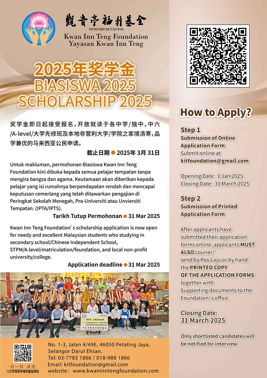 八打灵观音亭福利基金2025年奖学金即日起开始接受报名,开放就读于各中学、独中,中六,大学先修班及本地非营利大学、学院之家境清寒,品学兼优的马来西亚公民申请。