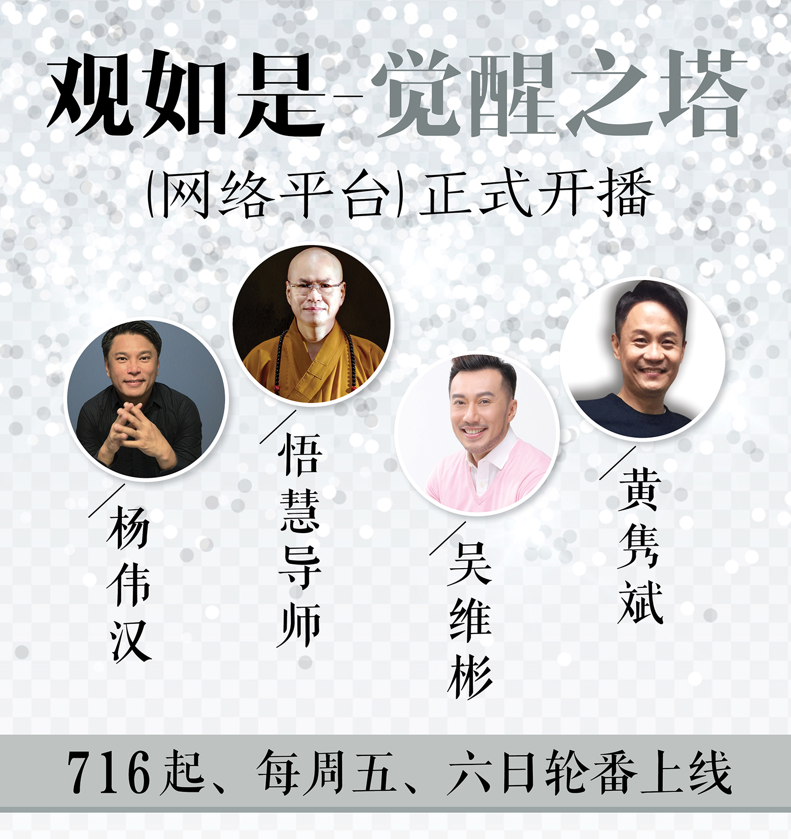 来自台湾法华慈住持悟慧法师、与近年专注于音乐剧的歌手杨伟汉、著名主持人黄隽斌、吴维彬,承载着使命感,带领听众「空中结缘」,推介观如是-觉醒之塔网络平台。悟慧导师,从7月16日起,每周五、六和日与三位主持人在不同的单元里,以良善为出发点,在疫情期间把良善的语言和善念散播,与听众广结善缘。