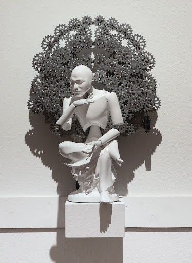 这一系列的佛像由各种机械零部件组成,有金属的厚重感,双目闭合的面部表情,又让它显得庄严肃穆。