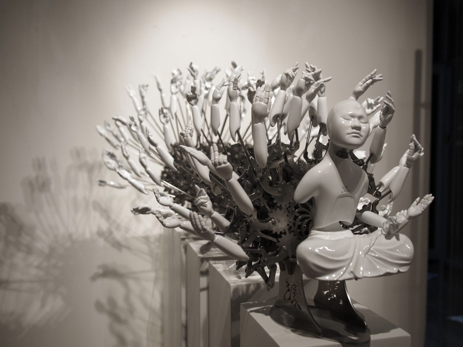 这并不是简单的拼接,从这尊千手千眼观音的神态,到手指摆放的动作,甚至于是坐垫,都是经过精心设计雕琢的。庄严肃穆的佛像艺术与现代机械结构的碰撞,绝对是一种大胆的尝试。