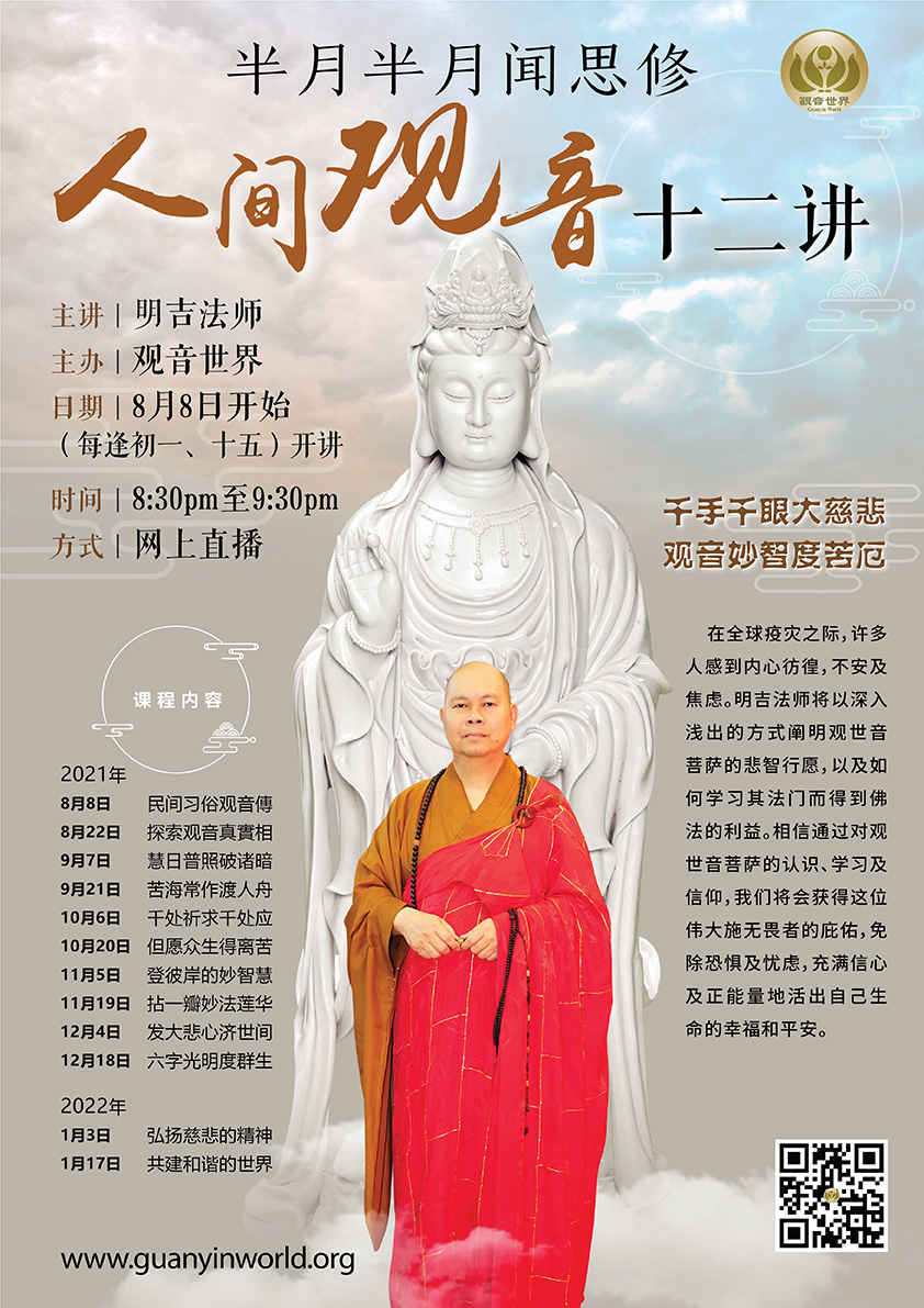 在全球疫灾之际,许多人感到内心彷徨,不安及焦虑。明吉法师将以深入浅出的方式阐明观世音菩萨的悲智行愿,以及如何学习其法门而得到佛法的利益。相信通过对观世音菩萨的认识、学习及信仰,我们将会获得这位伟大施无畏者的庇佑,免除恐惧及忧虑,充满信心及正能量地活出自己生命的幸福和平安。
