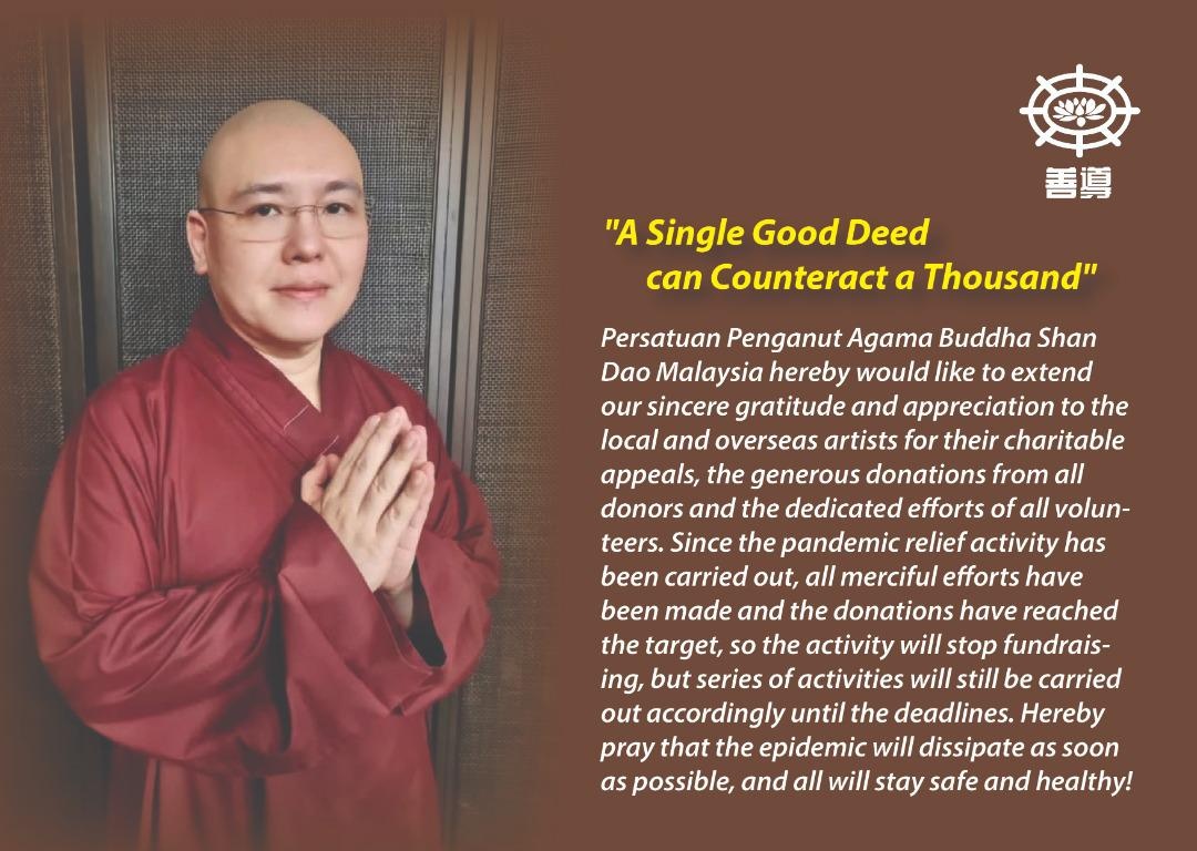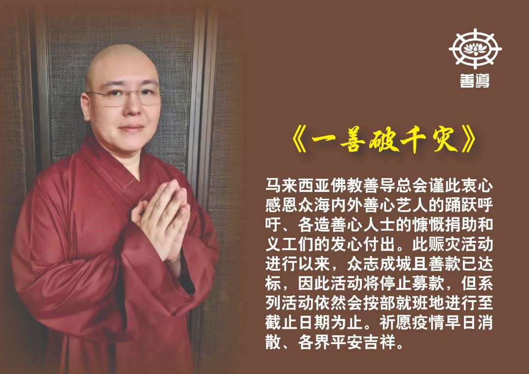 “一善破千灾”活动善款已达标,将停止募款,但系列活动依然按部就班的进行至截止日期为止。感恩所有善心人士捐助!施比受更有福!