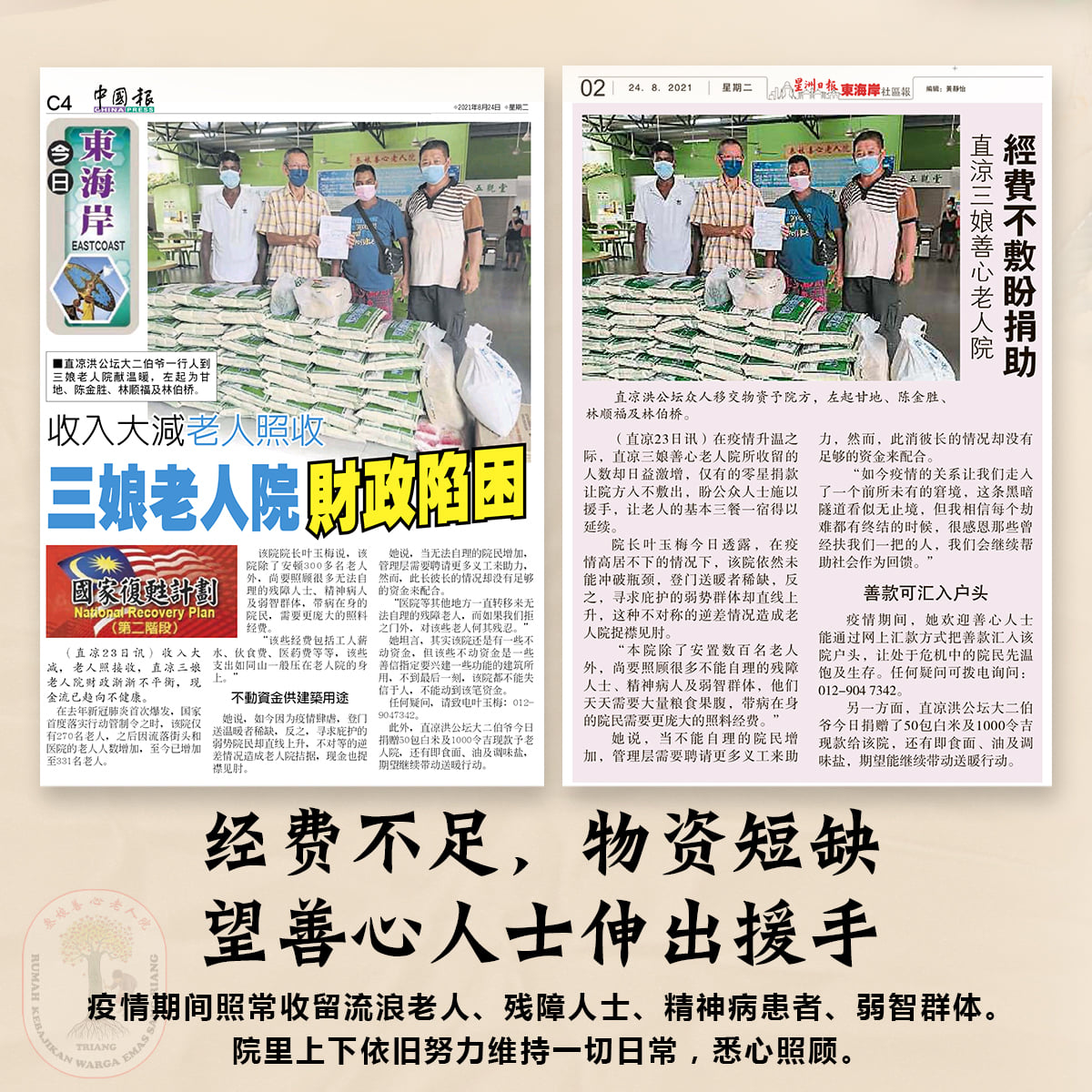 疫情期间,也继续收留需要帮助或者流浪的老人家,精神病患者、弱智患者和残障人士。由于目前全院有将近300名老人人数众多,希望可以得到更多资助与捐赠,好让院里的老人家们可以三餐温饱。