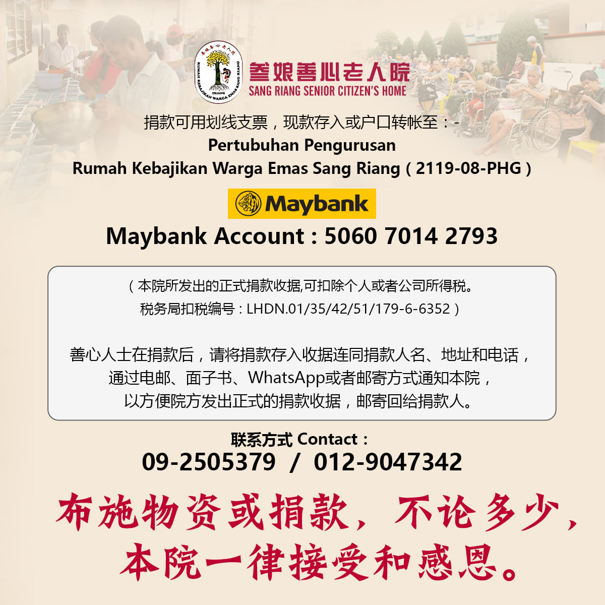 善心人士在捐款后,请将捐款存入收据连同捐款人名、地址和电话,通过Email、面子书或者WhatsApp,其中一种方式通知本院,以方便院方发出正式的捐款收据,邮寄回给捐款人。