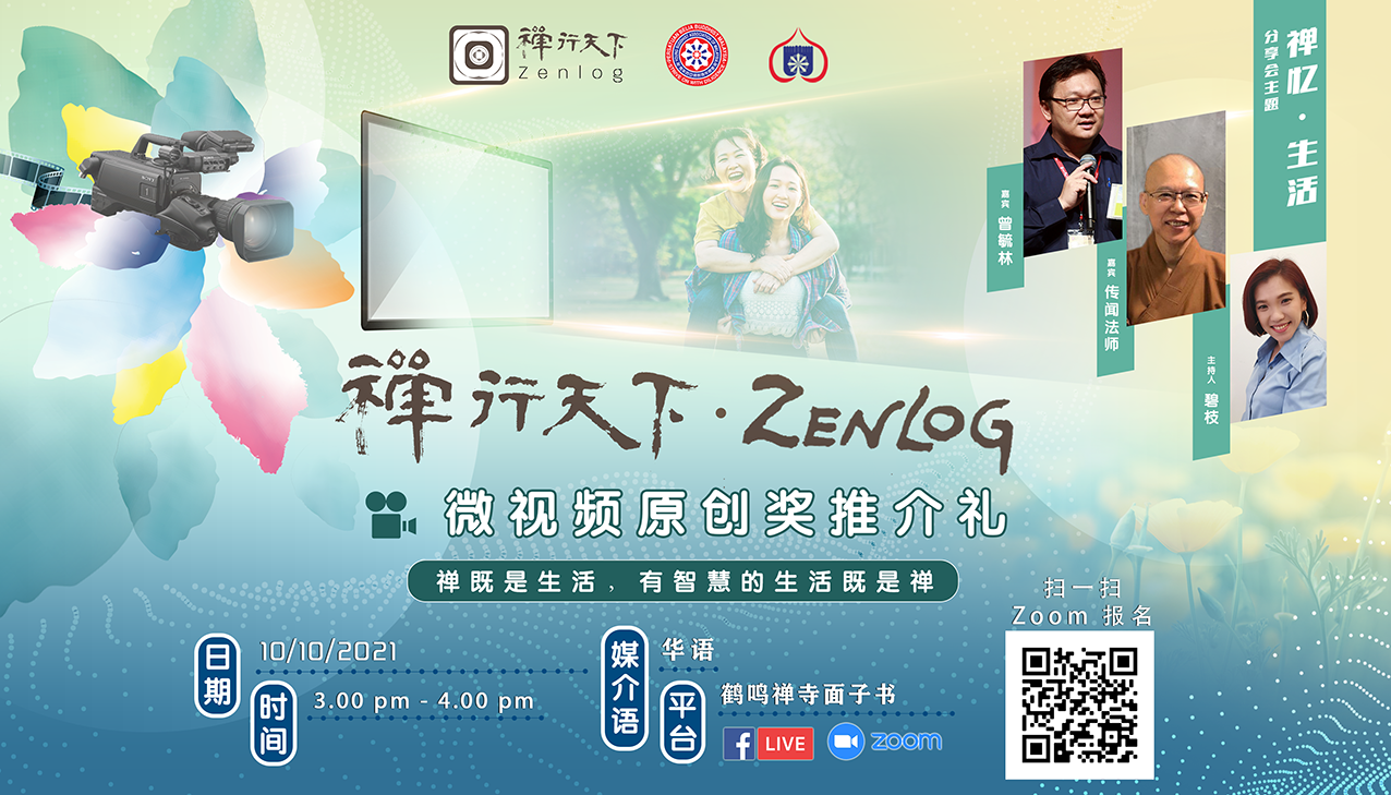 为了让大众更能掌握此活动的主旨,以及增加对“禅”的理解,本寺也将在2021年10月10日(星期日)下午3点钟,在鹤鸣禅寺面子书上主办一场《禅行天下·Zenlog》微视频原创奖暨《禅忆·生活》分享会,届时将会由两位嘉宾:鹤鸣禅寺住持传闻法师,以及星洲日报副执行总编辑曾毓林居士,为大家带来有趣、活泼、禅味满满的分享。