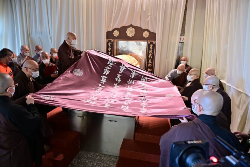 大典两点展开,由佛光山住持心保和尚,退居和尚心定和尚、心培和尚三师主法。唱香赞、诵念心经后,在“南无本师释迦牟尼佛”圣号声中,弟子们移法体真身上荼毗台,随后由长老们为大师棺椁覆盖经被,被上绣着大师自撰诗偈: