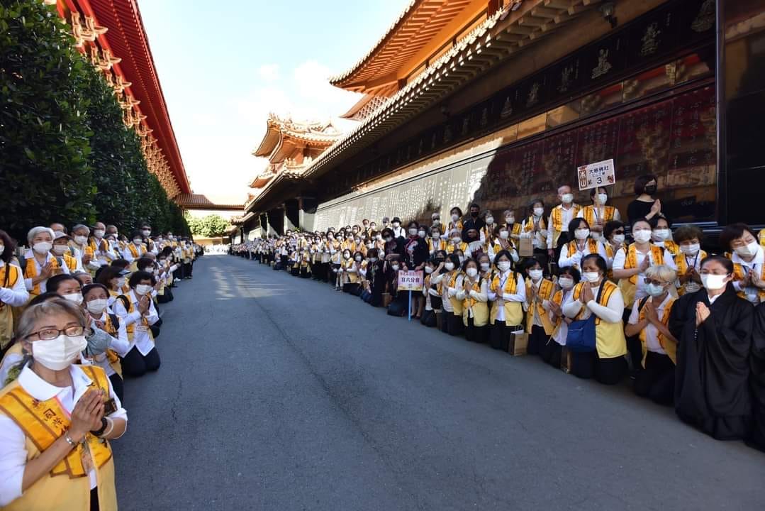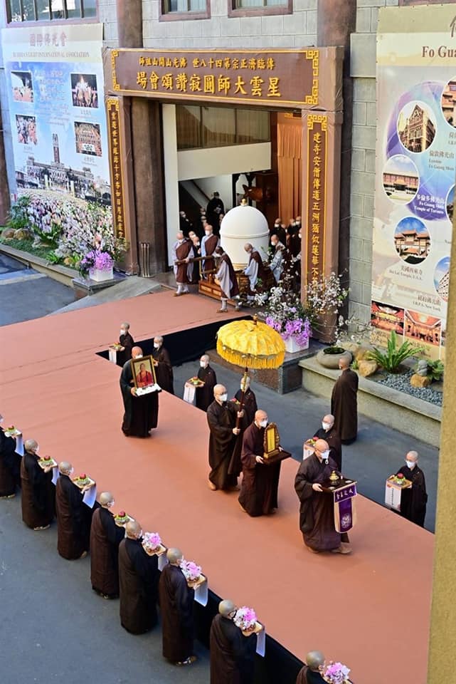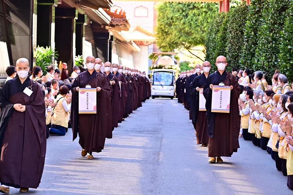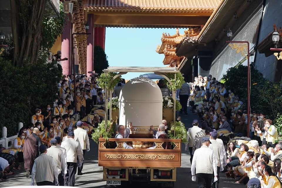 随后,由僧信二众夹道跪迎、恭送大师法体真身坐塔巡礼佛光山ㄧ圈,接着移往台南白河大仙寺举行“圆寂荼毗大典”。
