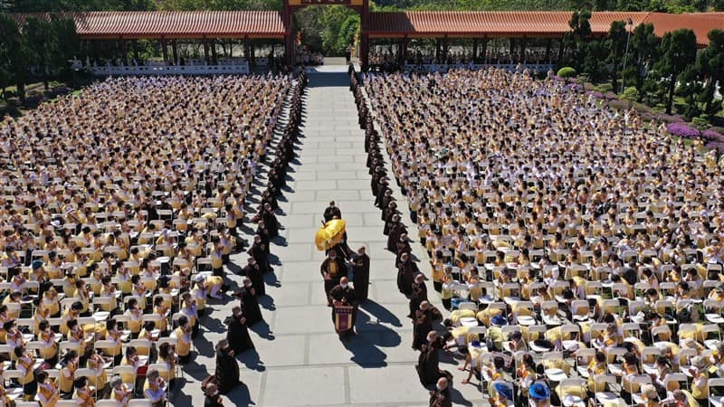 清晨六时,天色刚拂晓,来自海内外各地民众就已陆续涌入佛光山总本山,有人特别从美国、欧洲、澳洲等地不远千里而来,双手合十、走入会场,全是为了向一代高僧献上最真诚敬意。络绎人潮从不二门一路绵延至成佛大道、大雄宝殿、云居楼,场景殊胜;来自韩国、台湾等近百家海内外媒体全程记录,典礼并透过网路LIVE直播,让五大洲信众同步观礼。