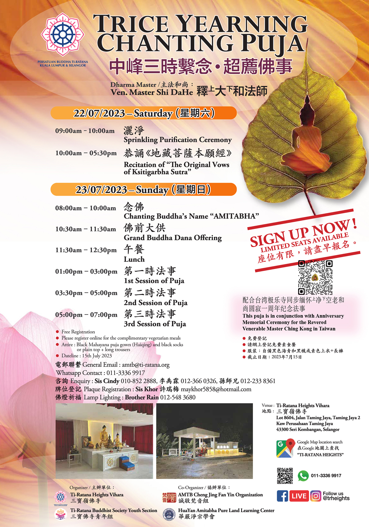 三宝岭佛寺(TI-RATANA HEIGHTS VIHARA),三宝佛学会青年组和一班雪隆佛弟子发心启建两日护世熄灾“中峰三时系念超荐佛事”。 协办单位有诚敬梵音组和华严净宗学会。