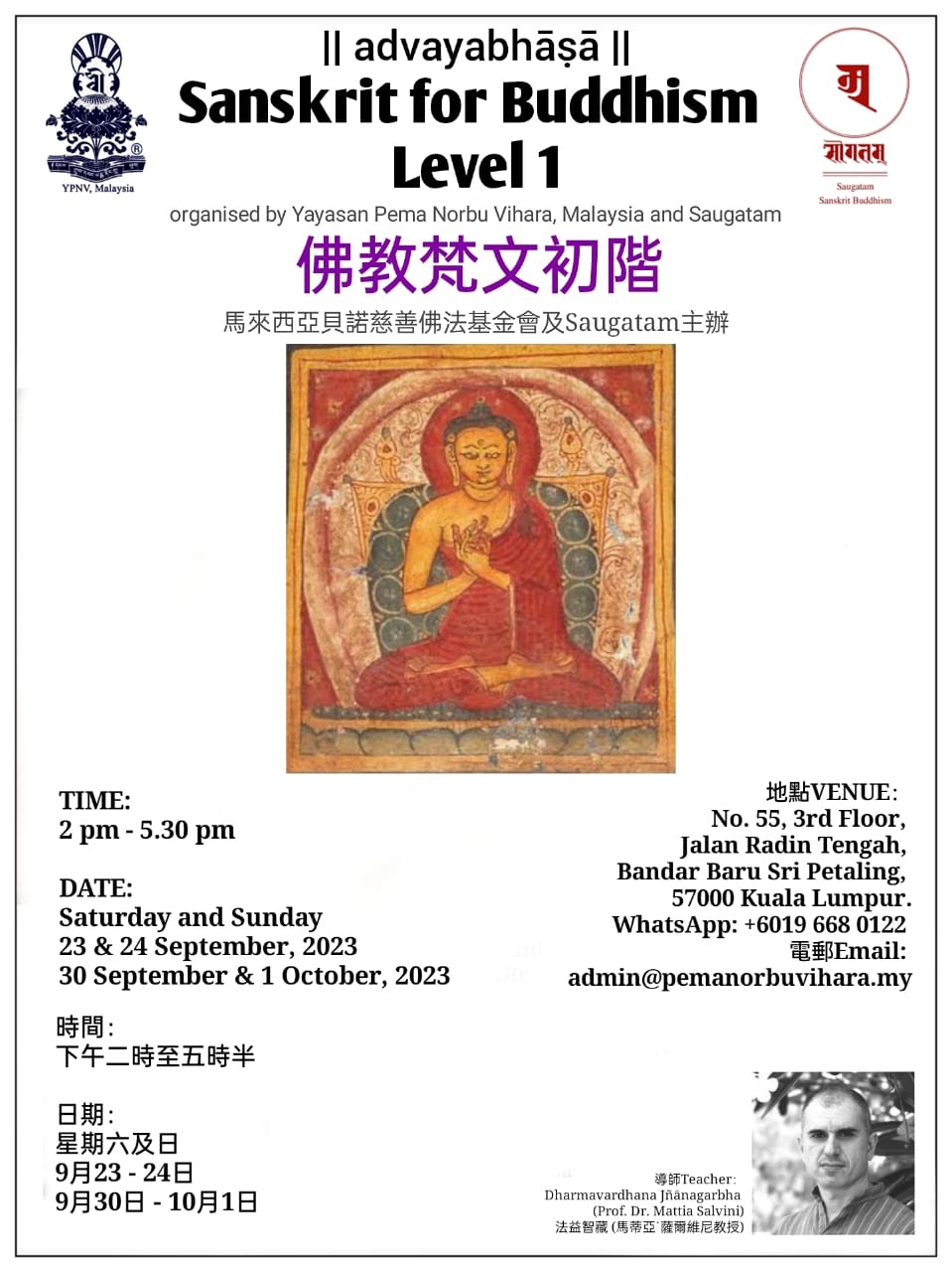 “马来西亚贝诺慈善佛法基金会”联合Saugatam 学会定于9月至10月的两个周末举办梵文初阶课程。课程将包括梵文语法基本特点概述,以及阅读佛教经典,导师为马蒂亚·萨尔维尼教授 。