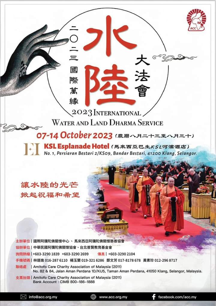 由“国际阿弥陀佛关怀中心”(ACC)及“马来西亚阿弥陀佛关怀慈善协会”主办的《2023国际万缘水陆大法会》将于10月7日至14日在巴生KSL河滨酒店盛大举行,这场为期八天七夜的水陆大法会,汇聚一百位法师朗朗诵经声共襄盛举,来支持ACC发起人慧礼法师以“法传非洲,续佛慧命”为轴心,视“兴学济贫。人文关怀”为职责,让送爱到非洲有更实际的意义和作法。