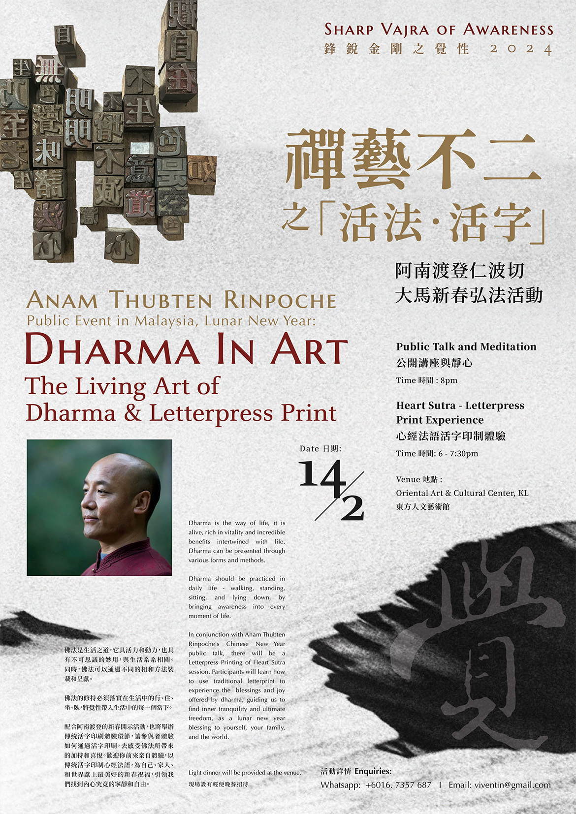 配合阿南渡登于2月14日(情人节)在东方人文艺术馆晚上8点举办新春开示活动,当天下午6点至7点半也将会举办传统活字印刷体验环节, 让参与者体验如何通过活字印刷, 去感受《心经》佛法所带来的加持和喜悦。