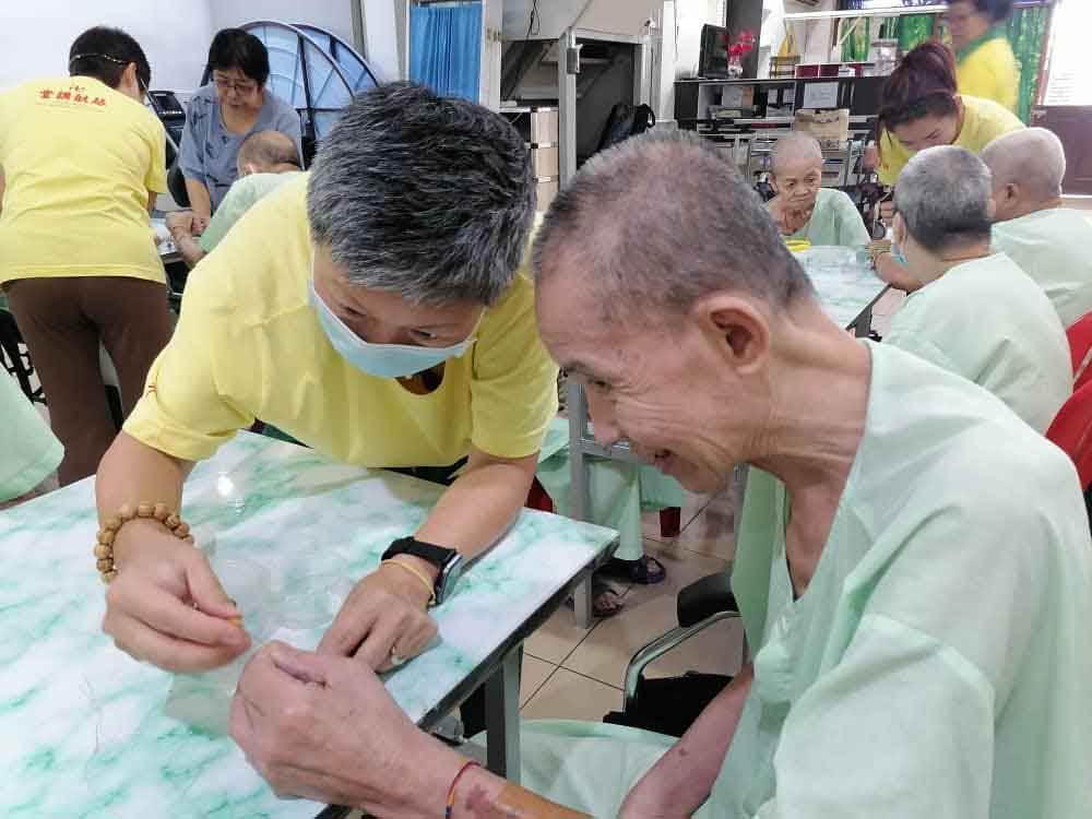 “净愿慈怀之家”的宗教顾问常妙法师法师叮咛院友每串一粒珠子就念一声阿弥陀佛。