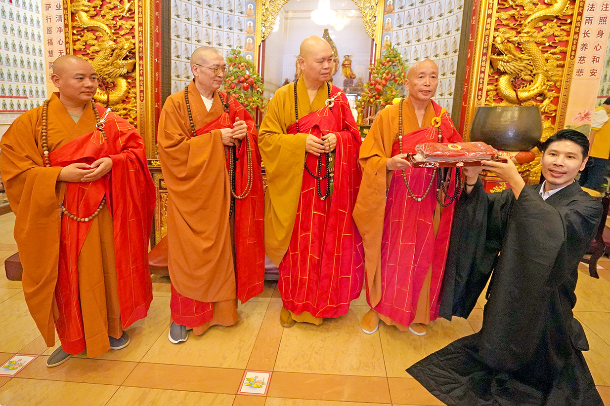 图从左一开始:顿照法师、慧照法师、明吉法师、印觉法师见证刘庆伦居士移交伯圆长老珍贵遗物。