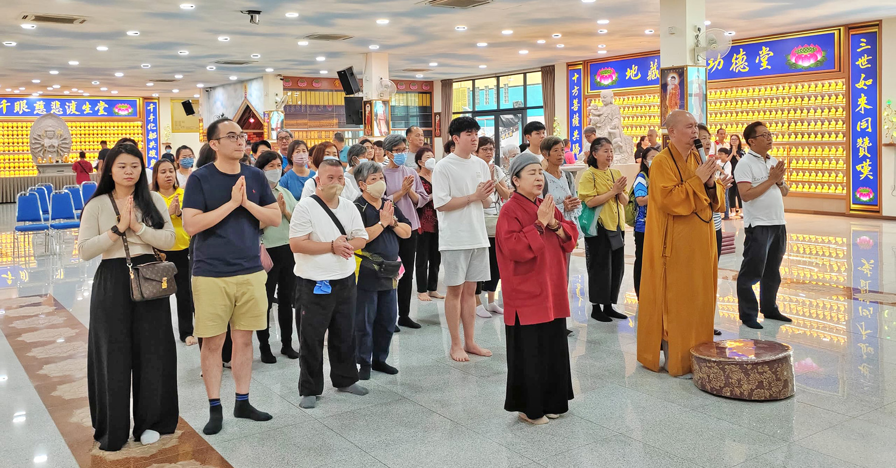 念佛堂的功能即是接引大家回归心灵的故乡,明吉法师带领大家诵念佛号。