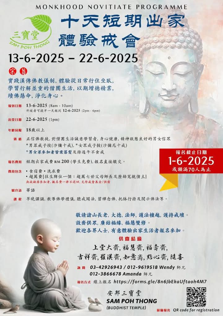 吉隆坡安邦“三宝堂”将于6月13日至22日举办10天短期出家体验戒会,欢迎有兴趣体验僧团生活的信众尽早报名,“三宝堂”特邀请法尊法师主导整个短期出家体验戒会。