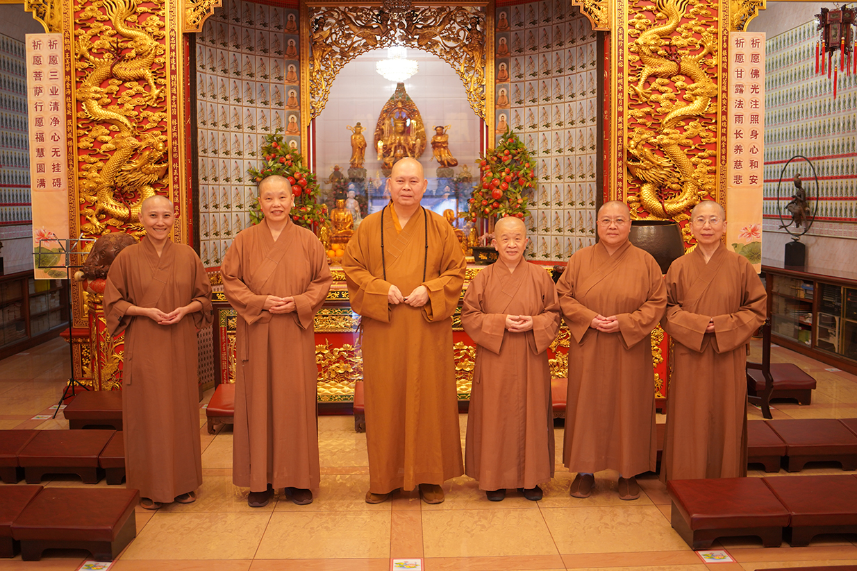 明吉法师和到访的圆光佛學院、佛研所及禅寺的职事法师:见欢法师(右一)、清修法师(右二)、性严法师、性璁法师(左一)及性範法师(左二)在八打灵观音亭的大雄宝殿合照。